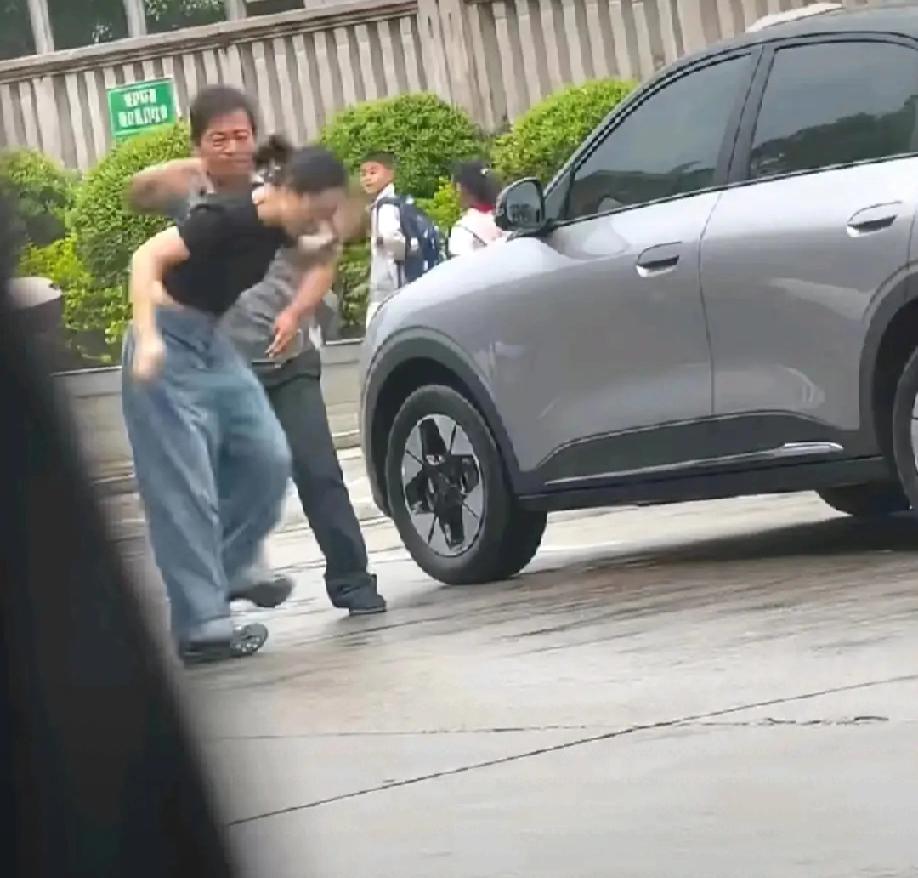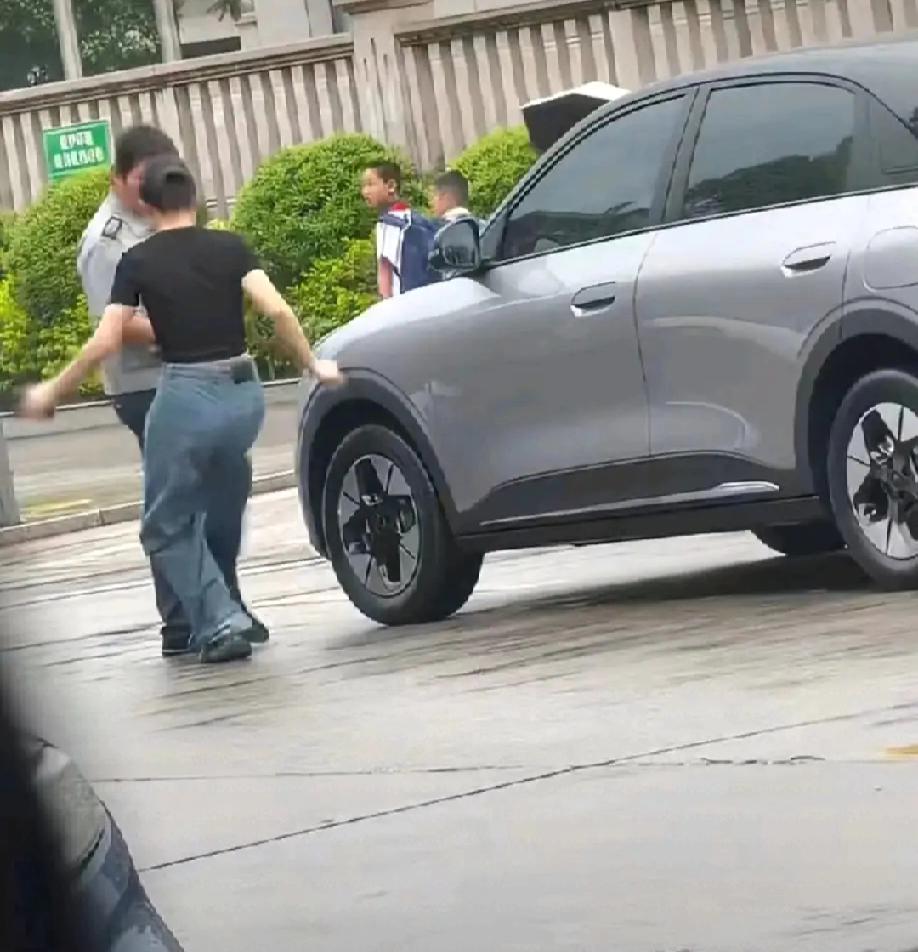 现场视频显示:保安不让女子在学校门口停车起争执,女子想下车理论,保安用力推车门夹到女子的腿。然后女子下车踢保安,保安一耳光把女子打得愣在原地……