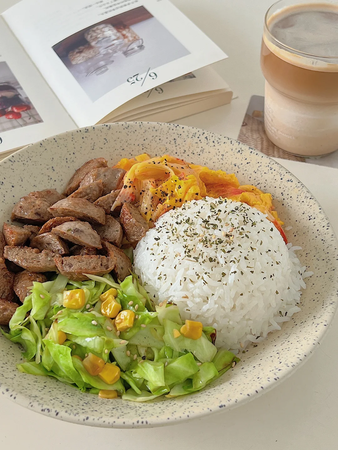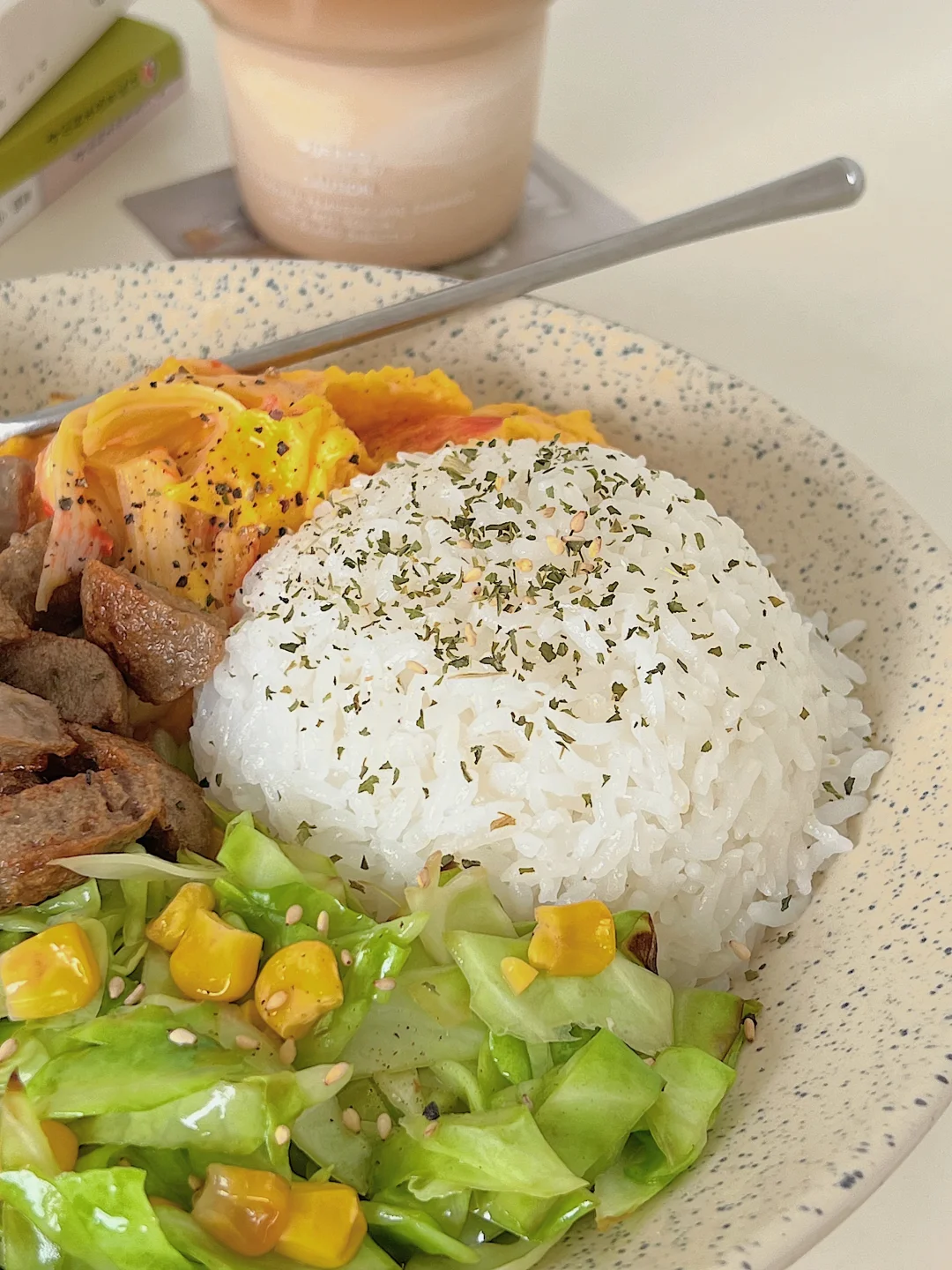 4️⃣把米饭压实,码上喜欢的食材,撒点欧芹碎,配杯冰拿铁,仪式感拉满!☕️