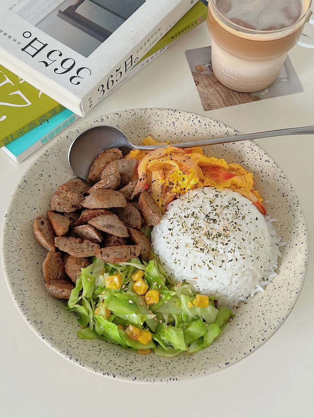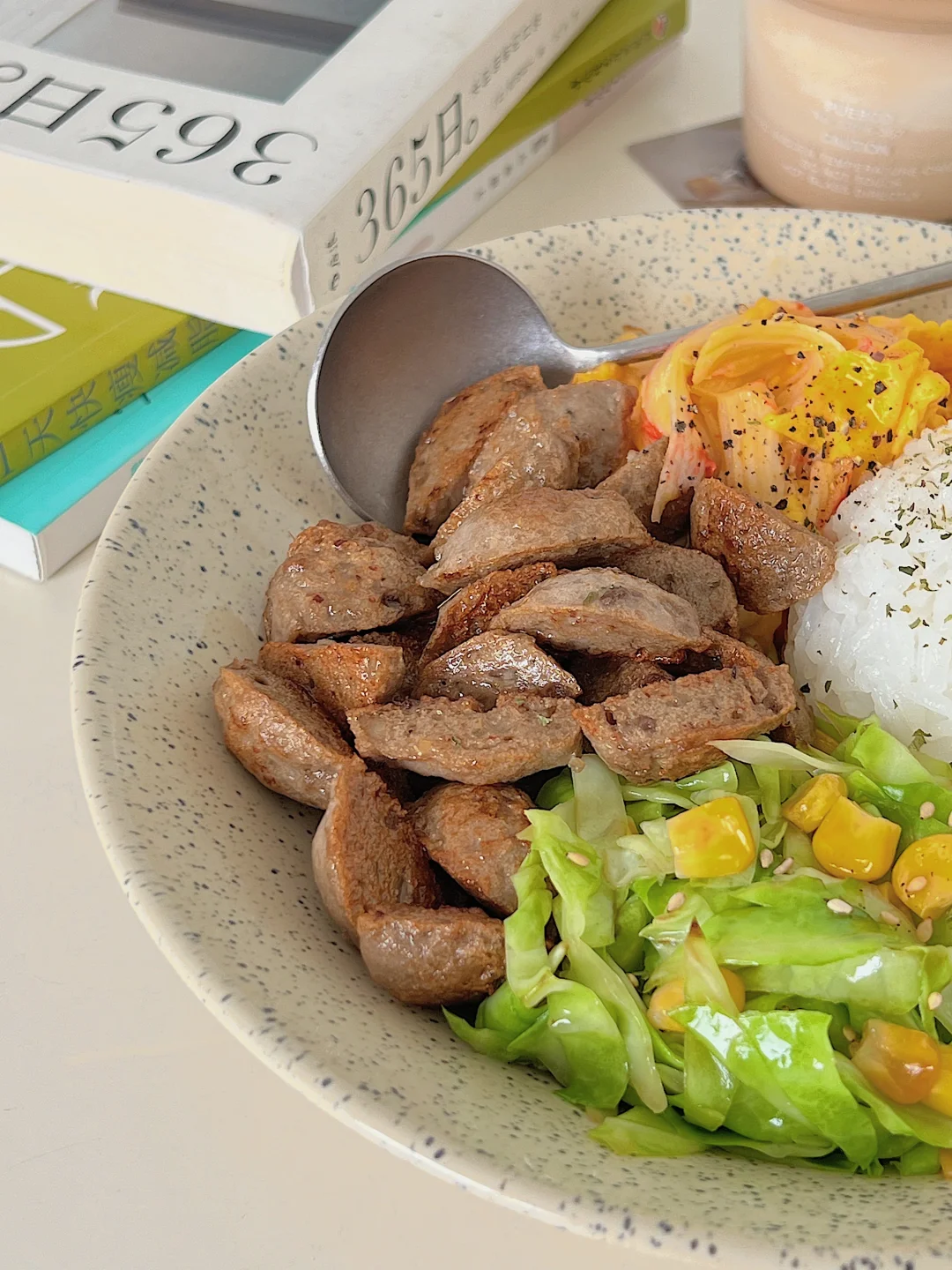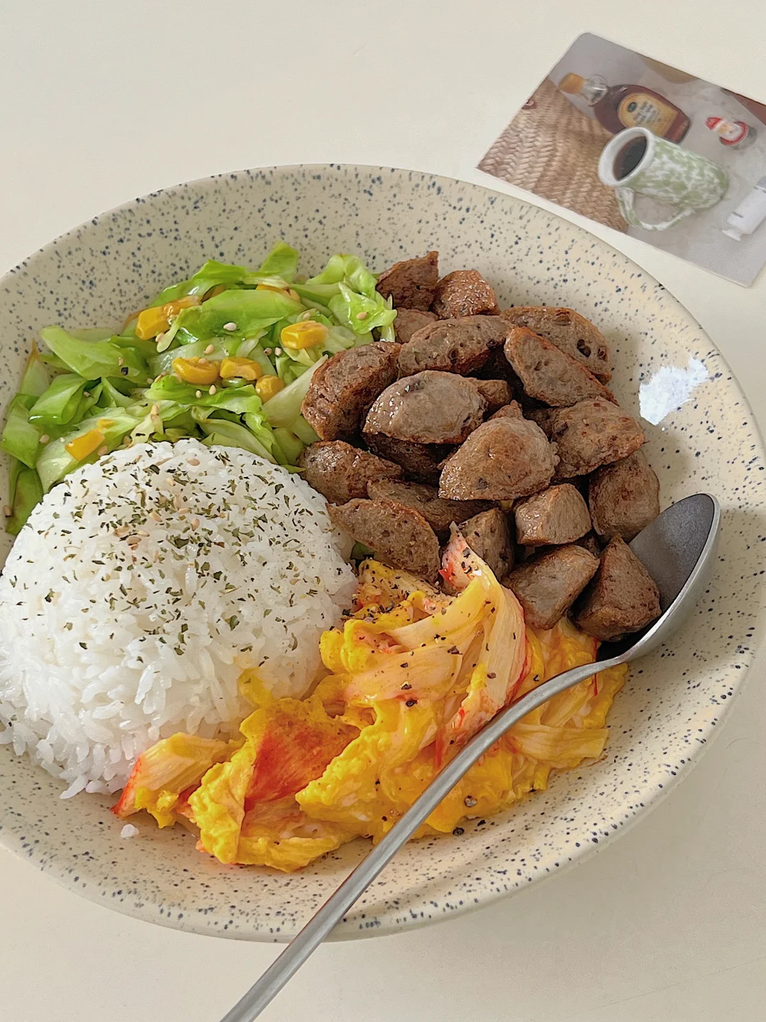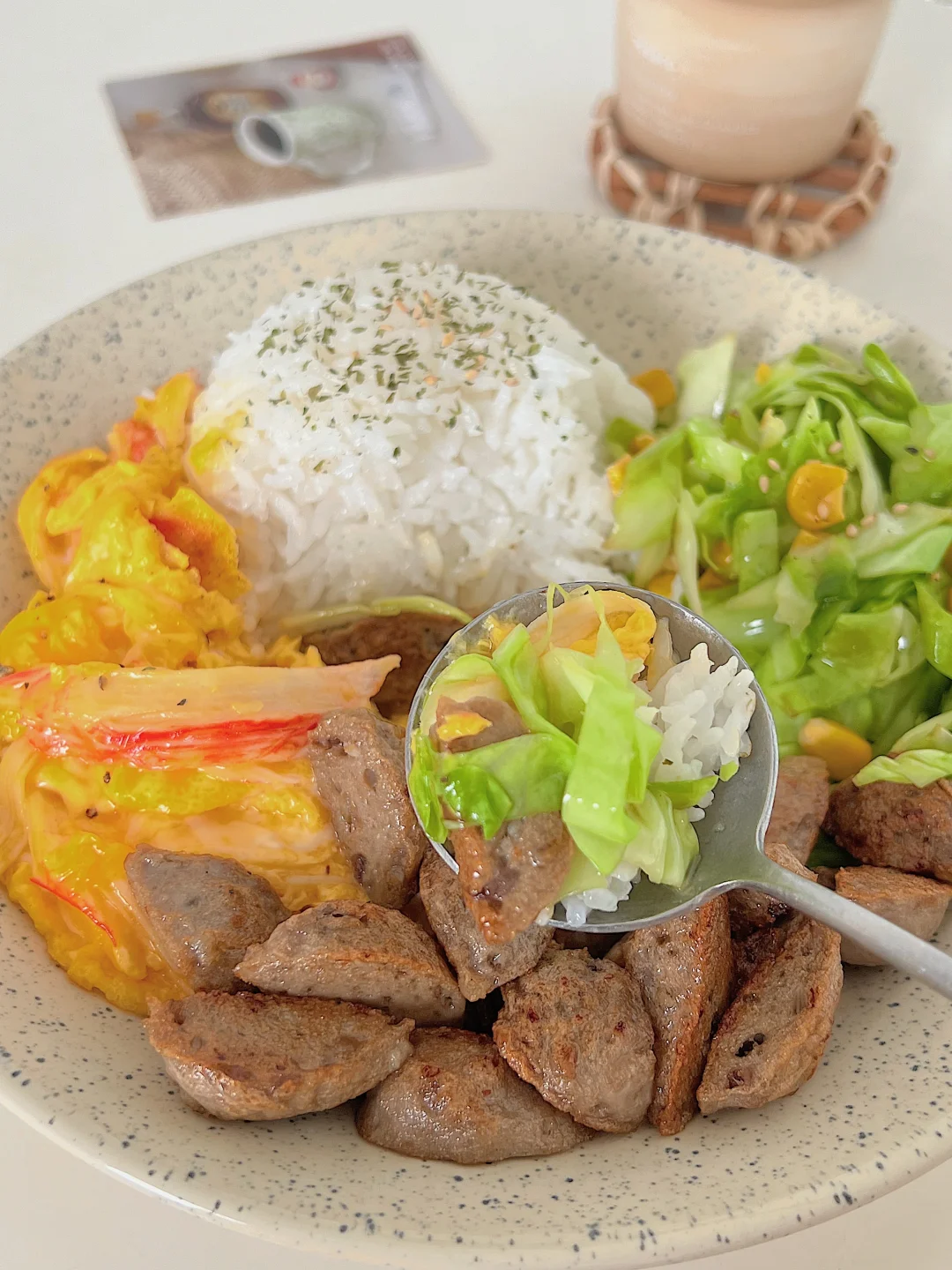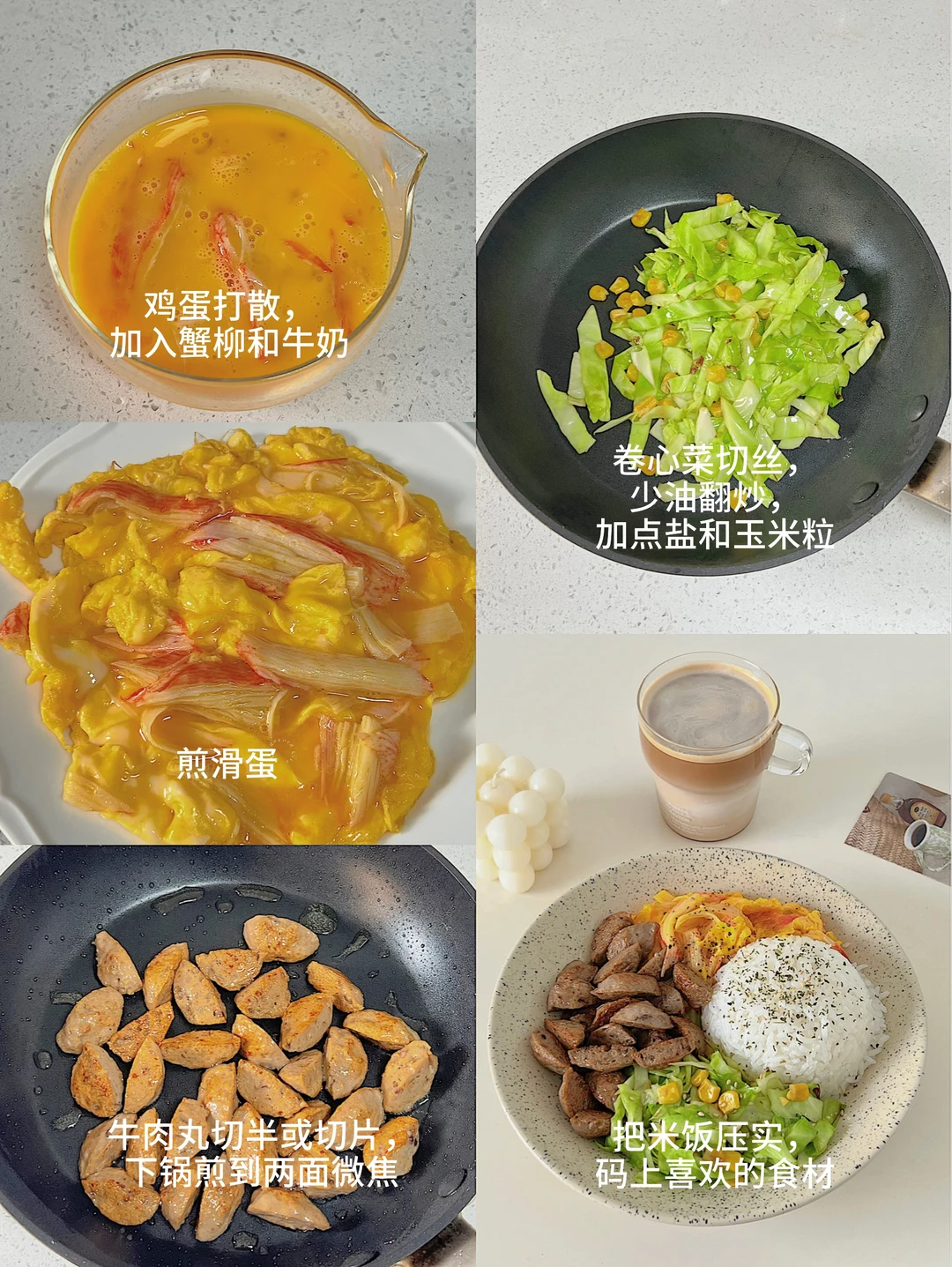 嫩滑的蟹柳滑蛋,焦香的牛肉丸,再来点清爽的炒卷心菜,一碗下去幸福感爆棚,低卡又饱腹,身材管理期能放心吃!💪