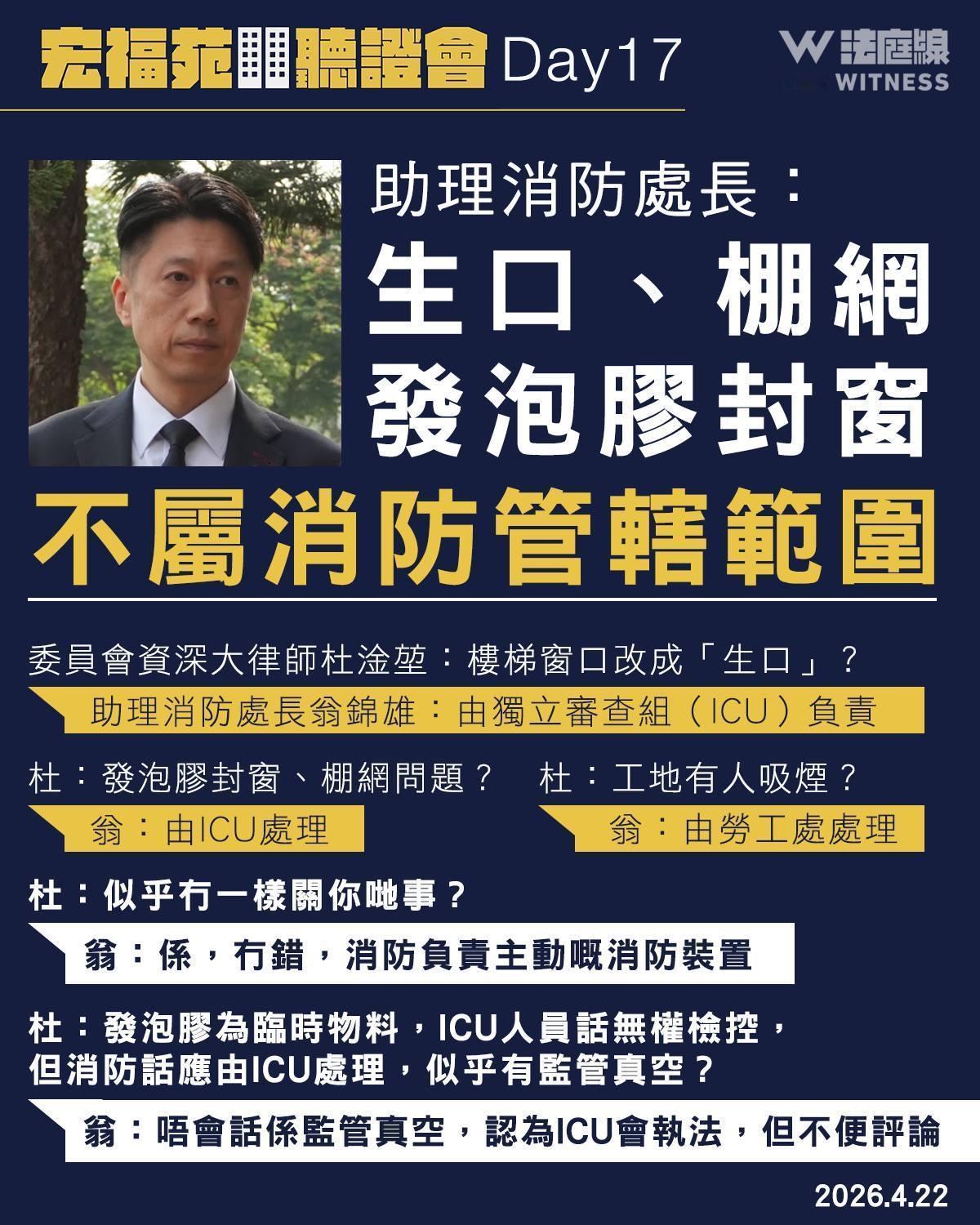 大埔宏福苑大火独立委员会今日举行第十七场听证会,再有消防处人员作供。