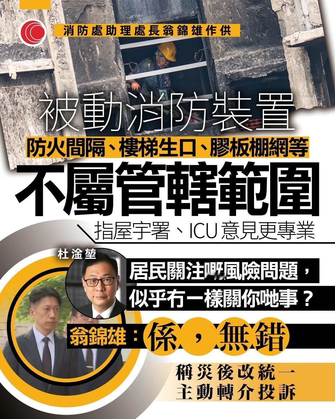 翁锦雄表示,消防负责处理“主动”消防装置,例如火警警报系统、洒水系统、喉辘等;“被动”消防装置如防烟门、走火楼梯、防火层,则由屋宇署和ICU跟进,因属楼宇结构的一部分。