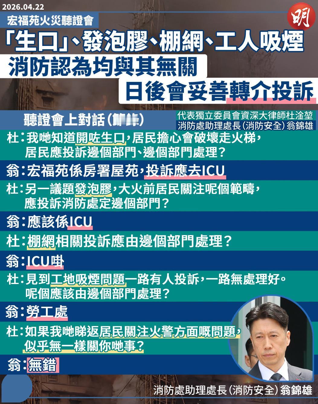 独立委员会首席代表、资深大律师杜淦堃问消防处助理处长(消防安全)翁锦雄:“似乎居民关注嘅火警风险问题,冇一样关你消防事?”,翁锦雄回应:“无错”。
