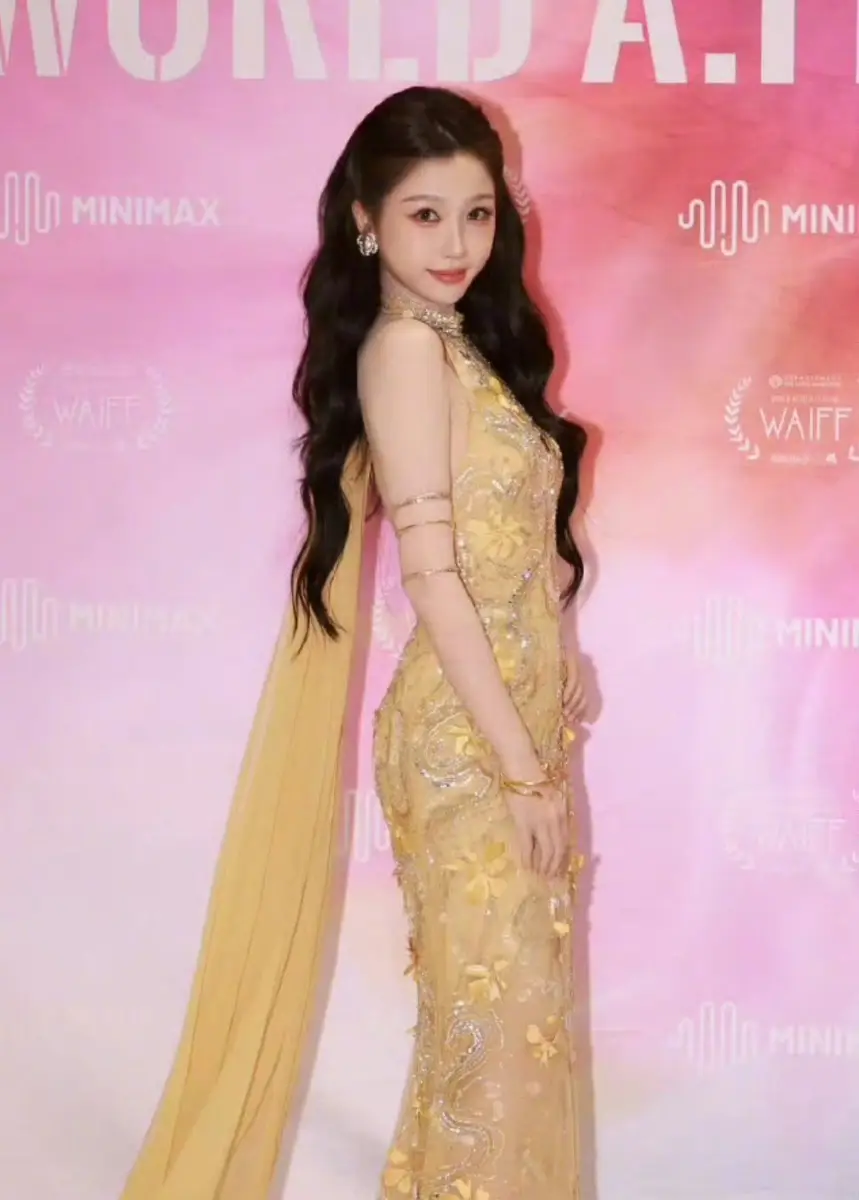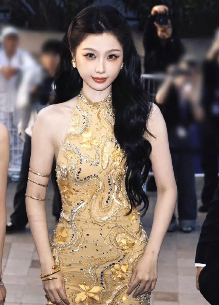 虞书欣身着金色紧身长裙勾勒腰线 长发及腰笑容迷人