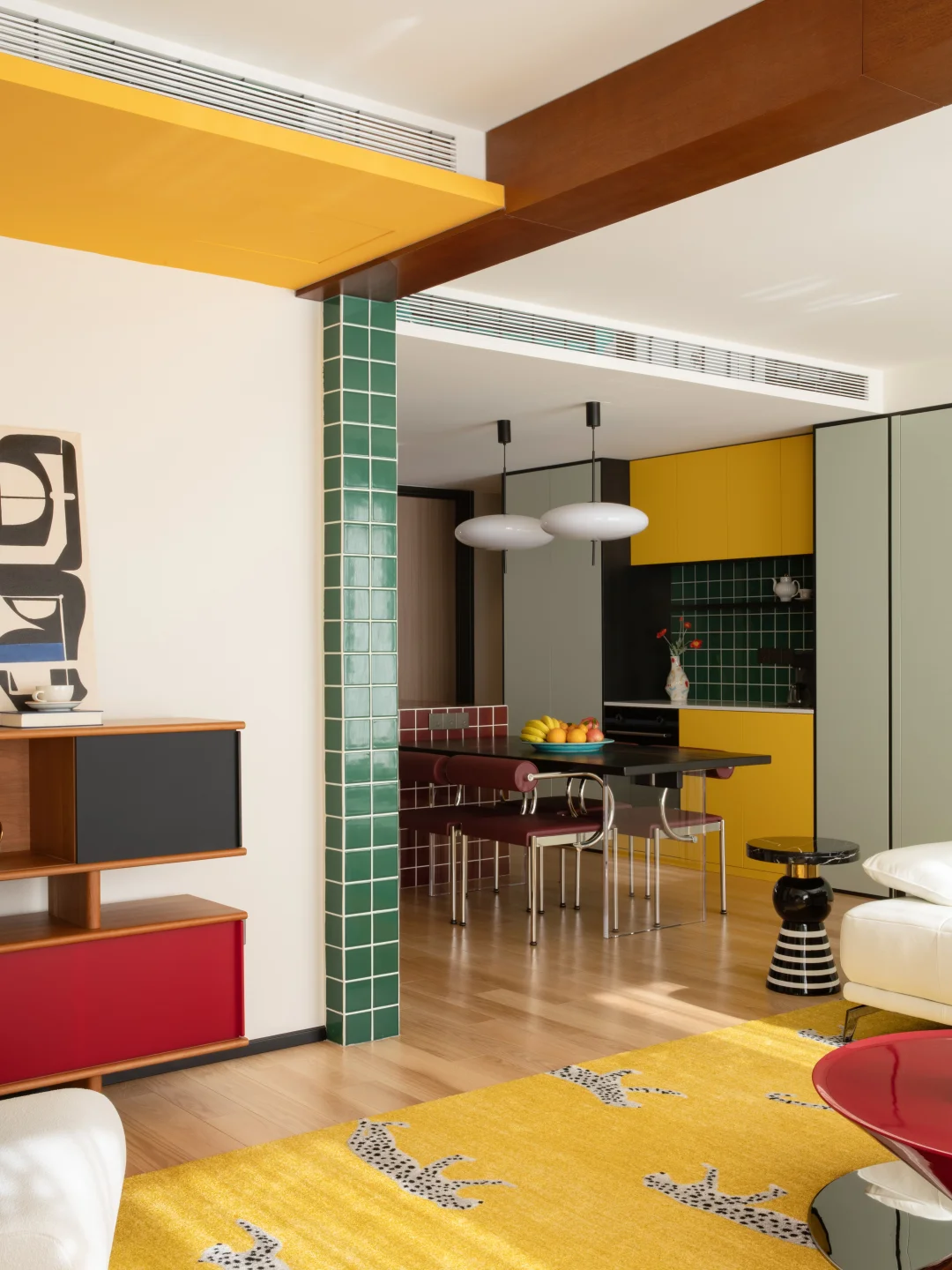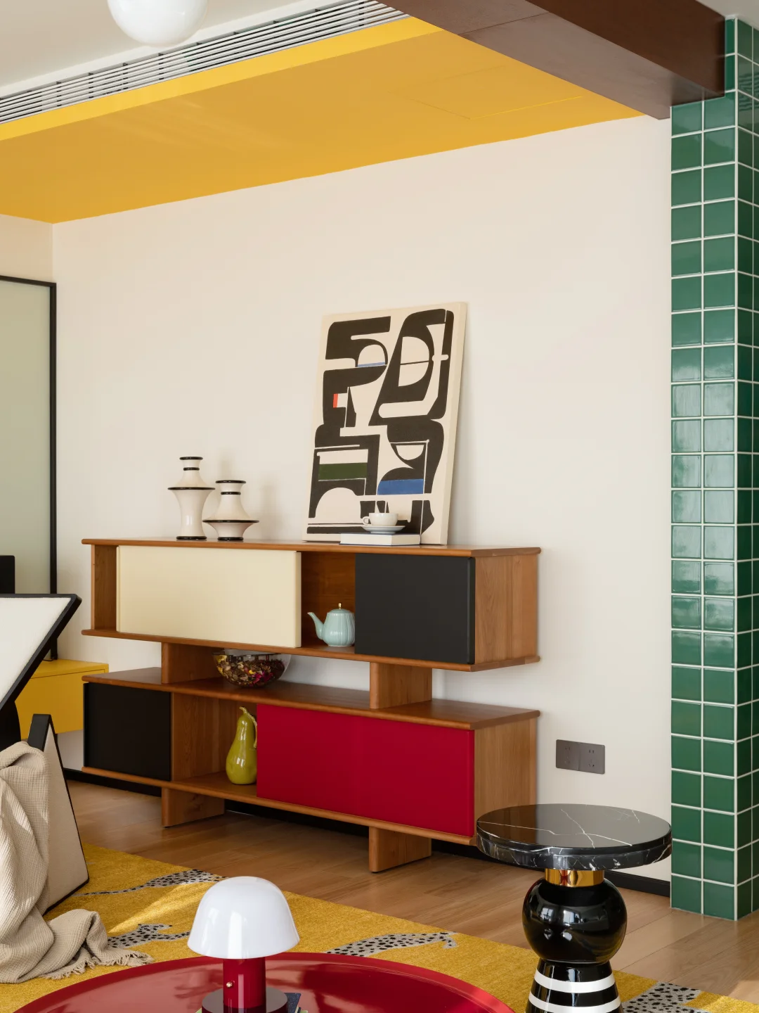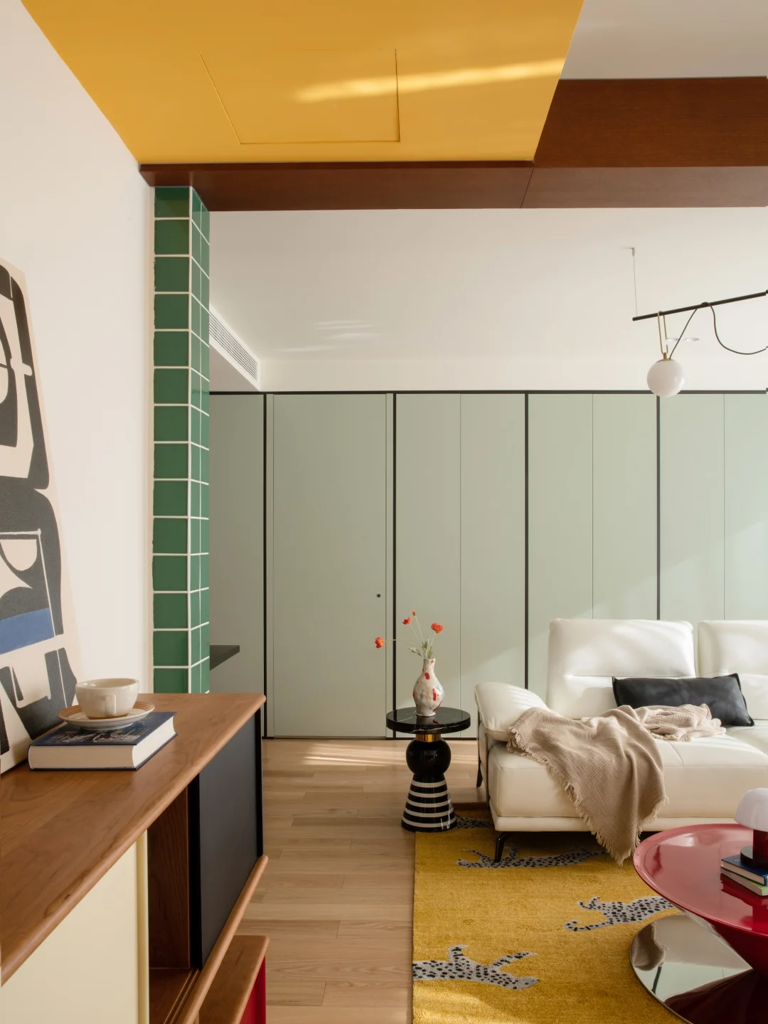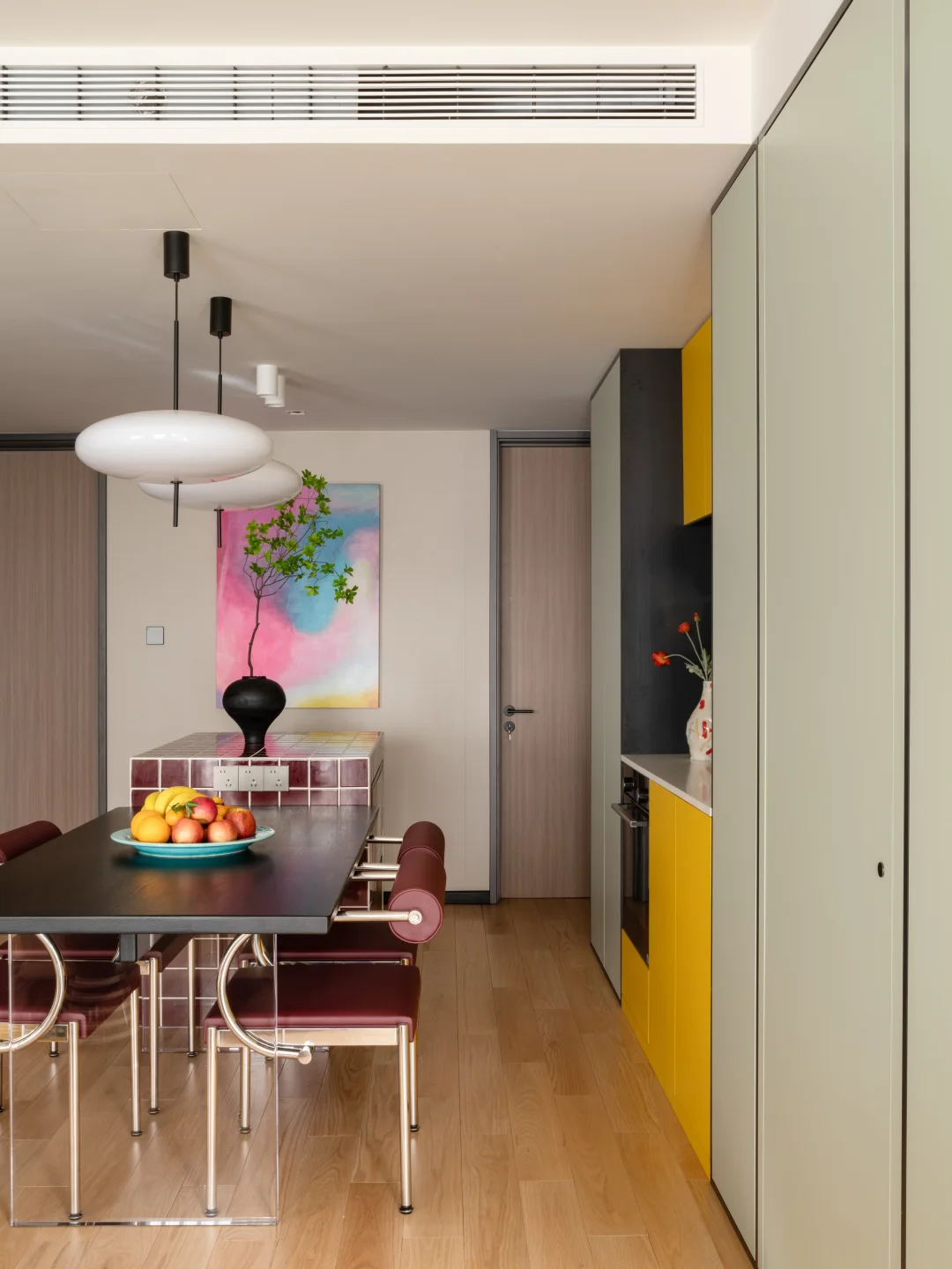 温润的实木地板中和了多巴胺色调,让整个家变得舒适松弛