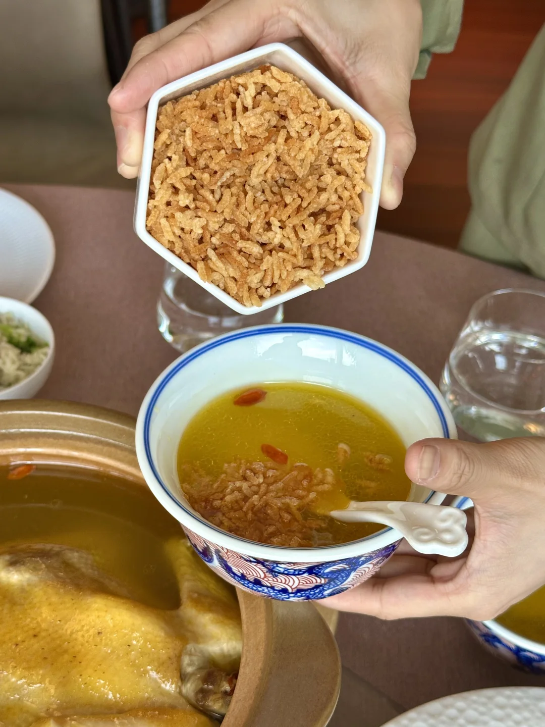 汤色金黄,味道醇厚,绝对是功夫菜。上桌先喝汤,再泡炒米,两种吃法都绝了!