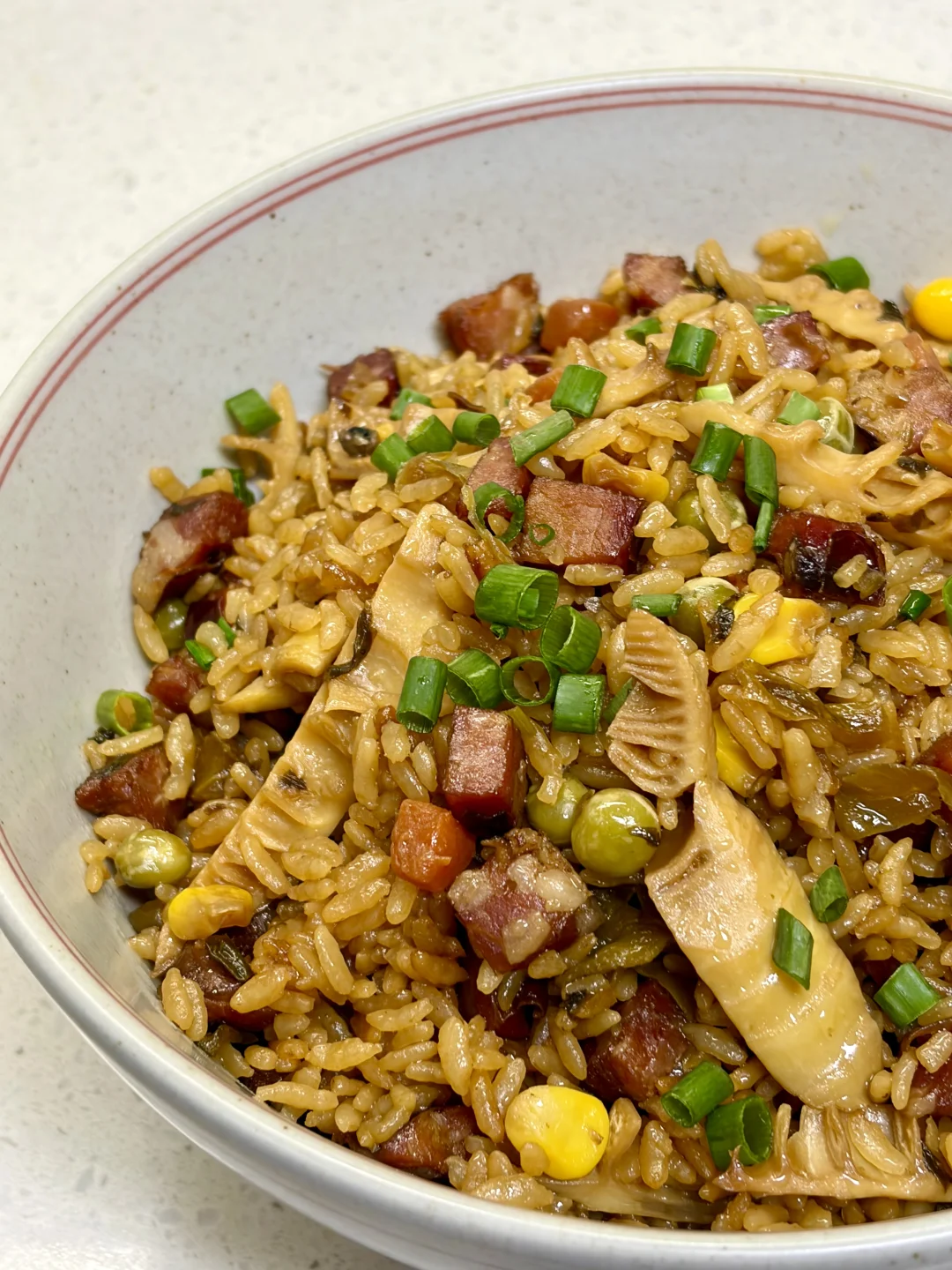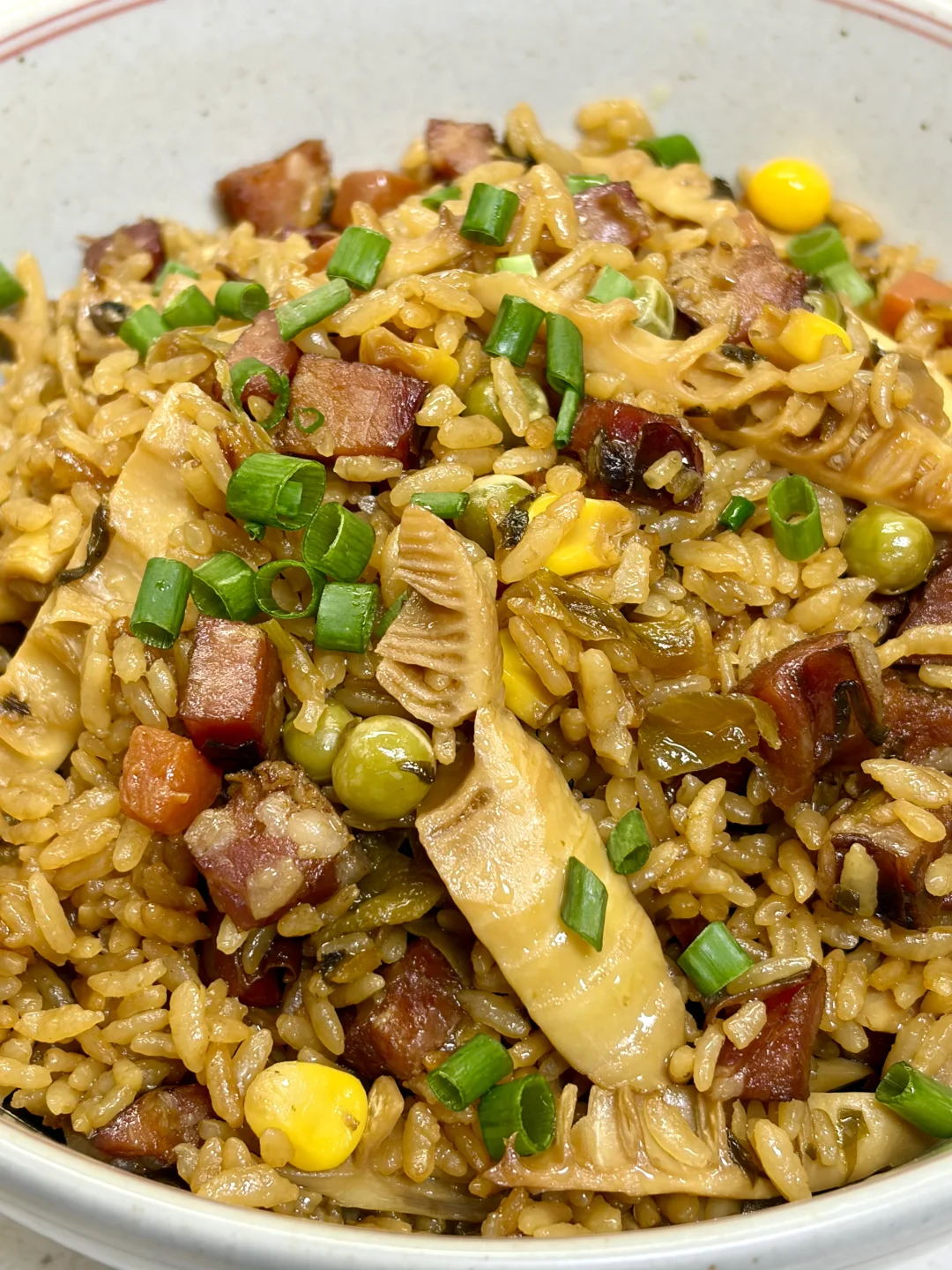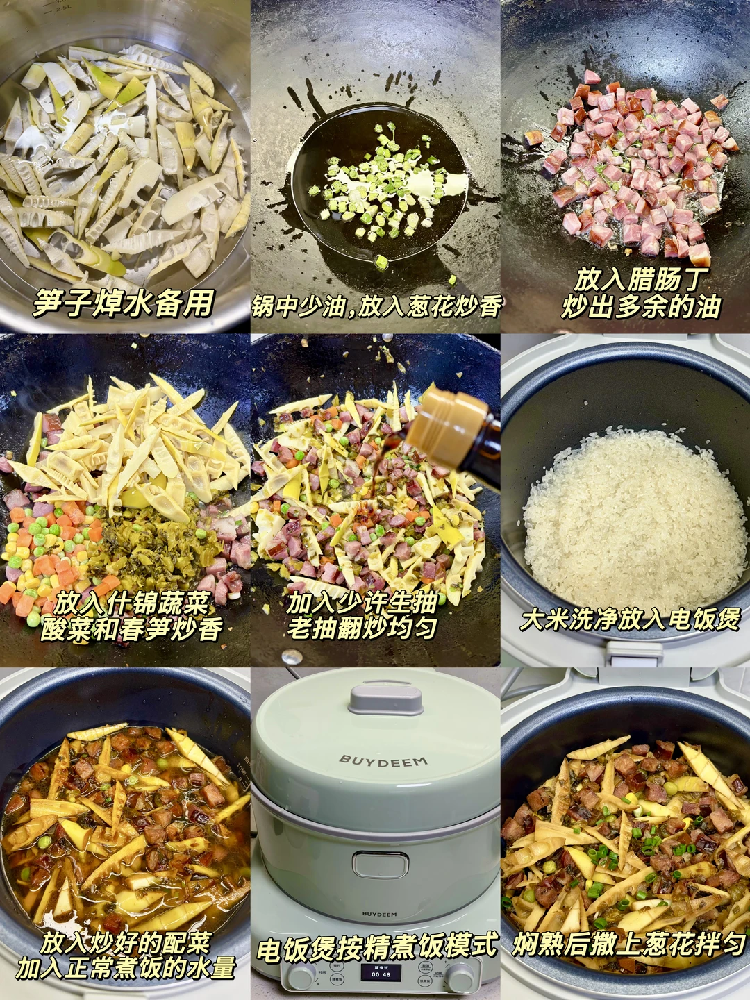1️⃣:春笋加少许盐焯水后备用,锅中油热放入葱花炒香,倒入腊肠丁炒出多余的油,放入什锦蔬菜,春笋,酸菜炒香,加入少许生抽 老抽翻炒均匀
