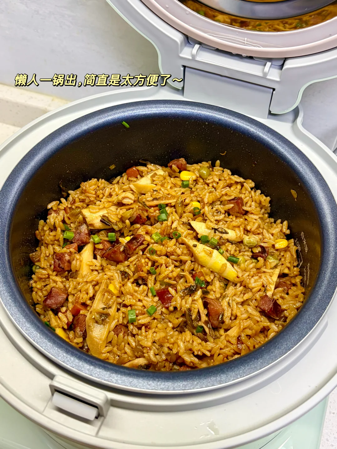 2️⃣:大米洗净放入电饭煲,加入正常煮饭的水量,炒好的配菜放到表面,按精煮饭键,焖熟后撒上葱花拌匀即可