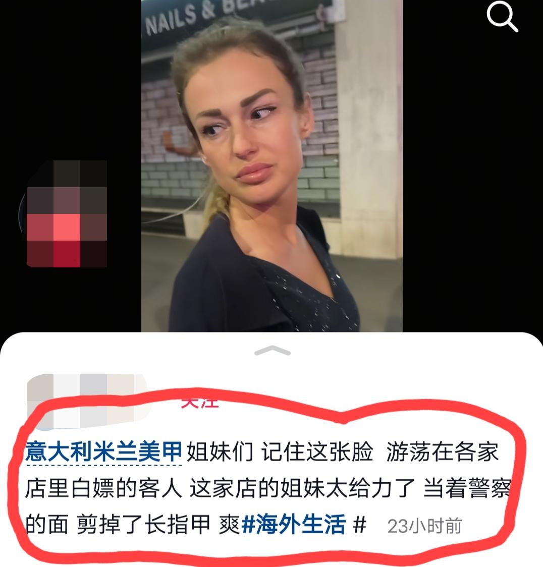 意大利米兰。一白人女子长期白嫖美甲店,但是这次碰到中国女人开的店,当着警察叔叔的面直接把做好的指甲剪掉……