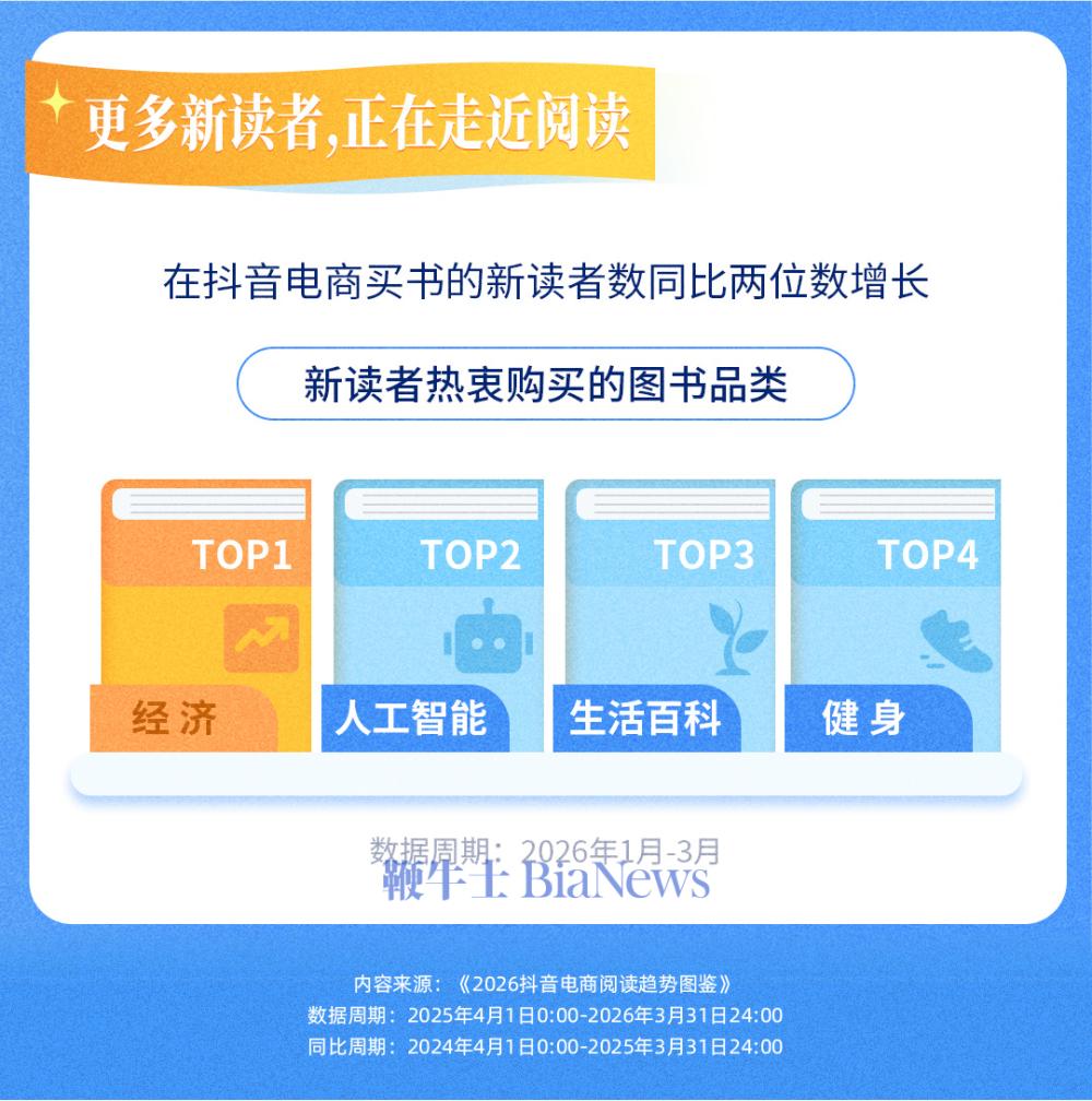 越来越多“新读者”开始在抖音电商买书、读书。2026年一季度数据显示,在抖音电商买书的新读者人数同比两位数增长。其中,新读者热衷购买的图书品类包括经济、人工智能、生活百科、健身等。内容推荐降低了阅读的发现门槛,也让更多原本并非高频买书、读书的人,开始基于兴趣进入阅读。