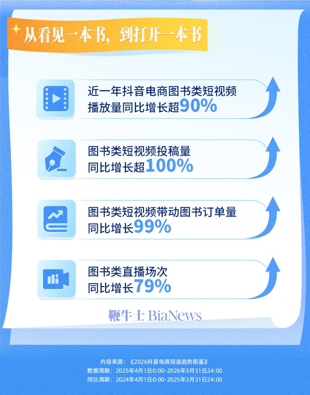 数据显示,截至2026年3月的近一年,抖音电商图书类短视频播放量同比增长超90%,图书类短视频投稿量同比增长超100%,图书类短视频带动图书订单量同比增长99%;图书类直播场次年同比增长79%。内容生态的持续活跃,不仅提升了图书被看见的机会,也让更多用户因内容种草而购买图书、走近阅读。