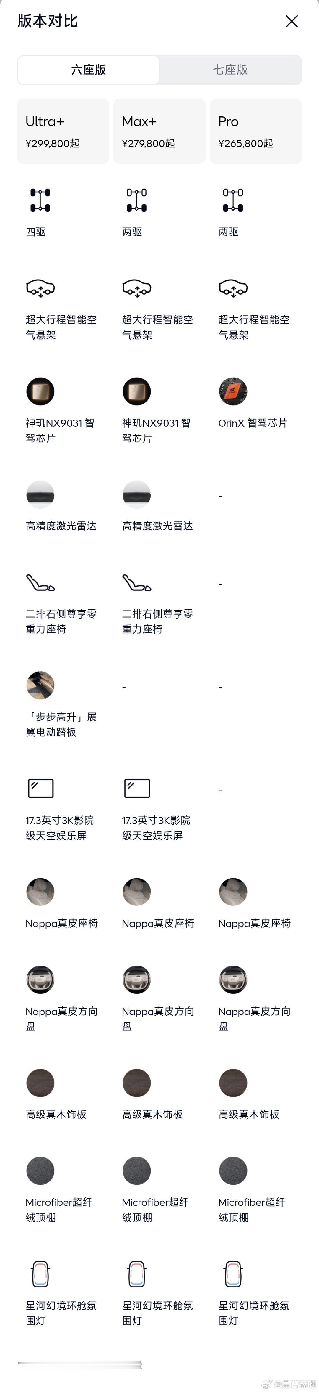 为什么我又推荐Ultra+呢?对于预算相对比较充足的人来讲,在30万级别的大三排SUV,你想得到的配置功能科技感,这个版型全都有了。有蔚来自研智驾芯片、蔚来世界模型、底层的整车全域操作系统,冰箱彩电大沙发全都有。