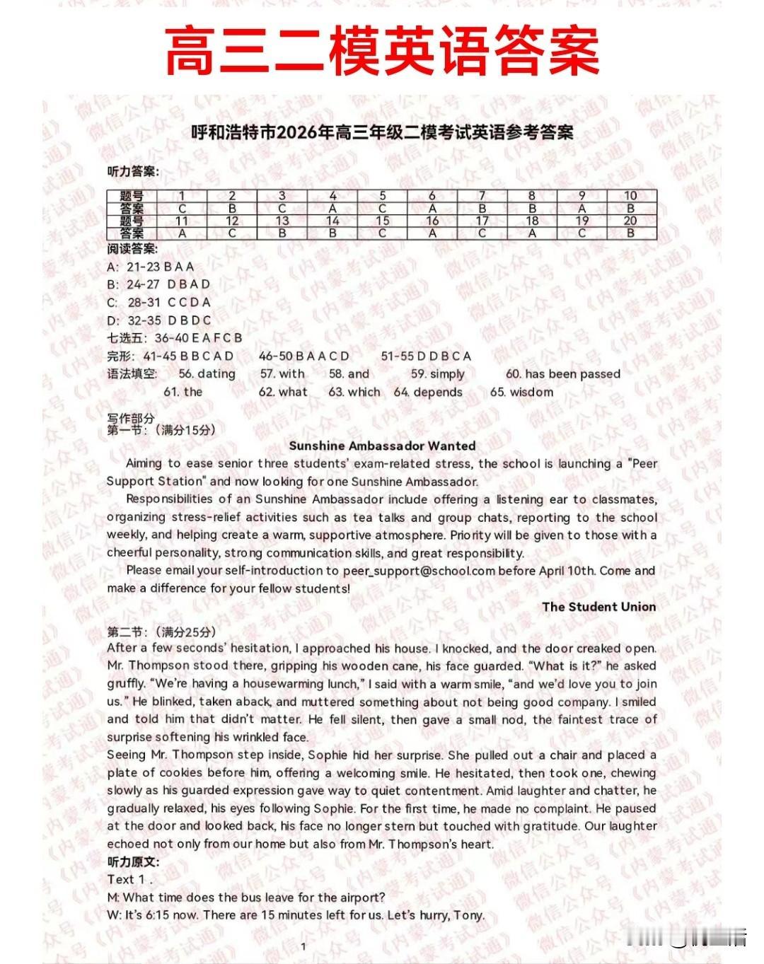 2026年内蒙古呼和浩特市高三二模历史英语答案