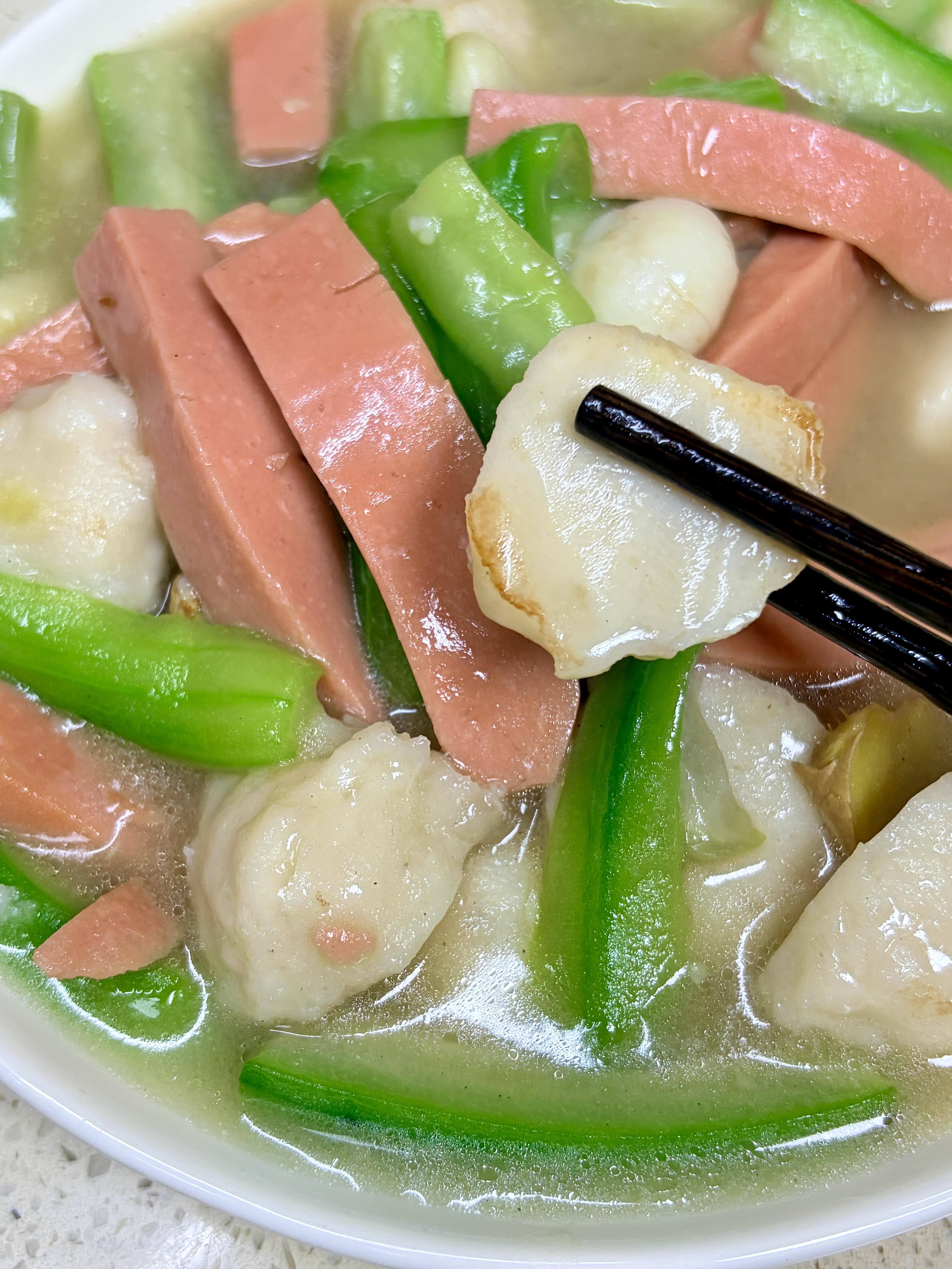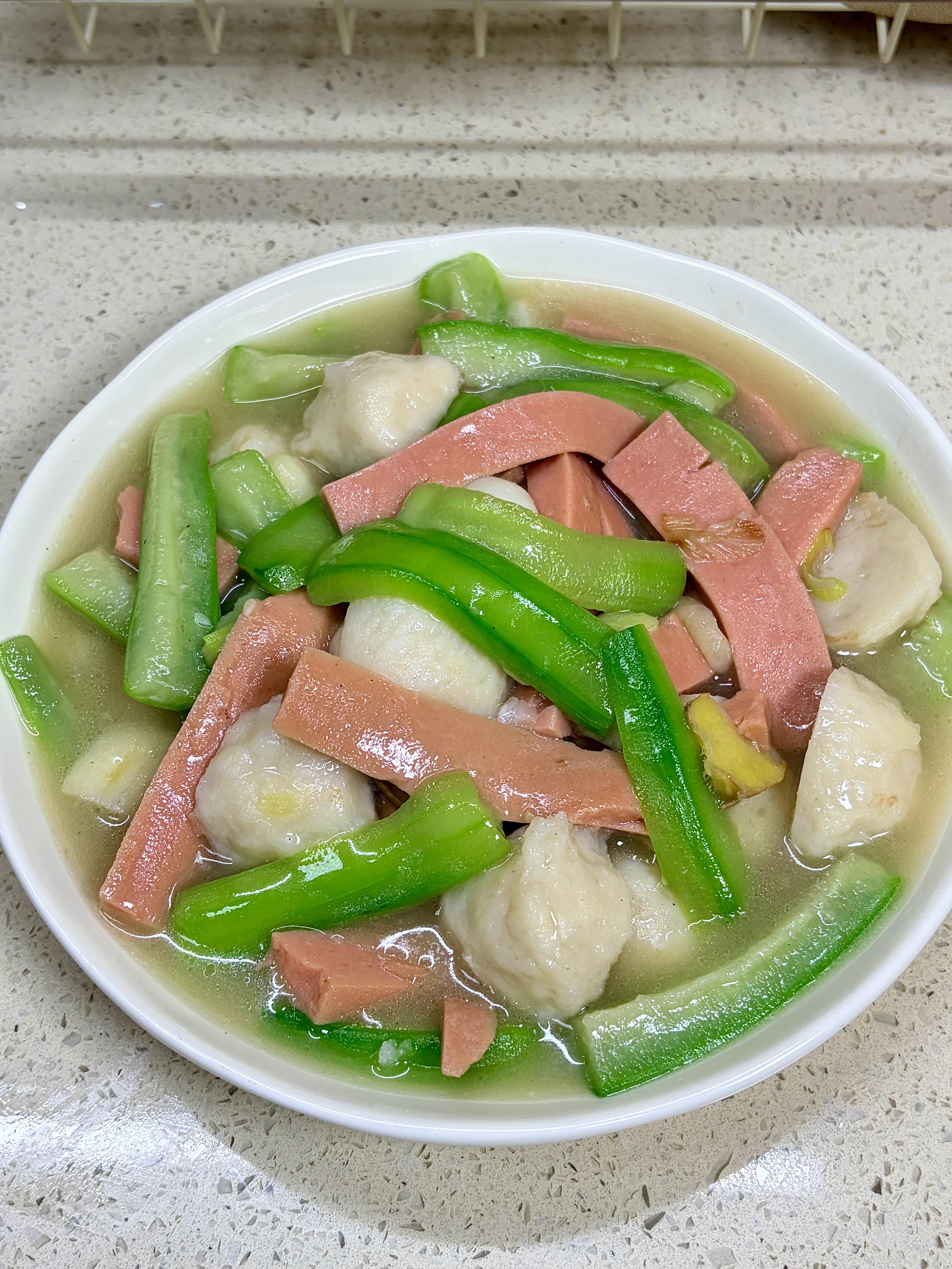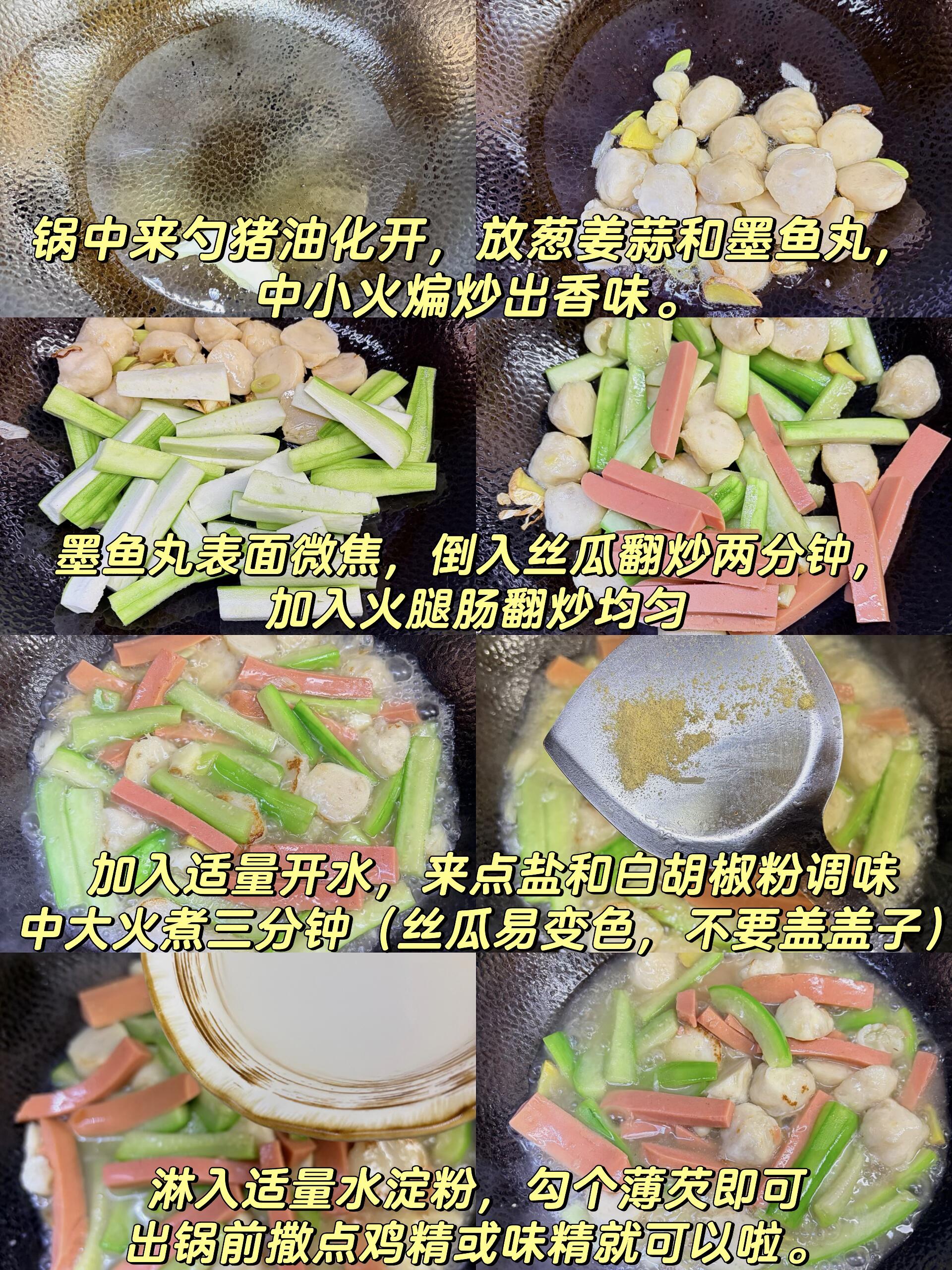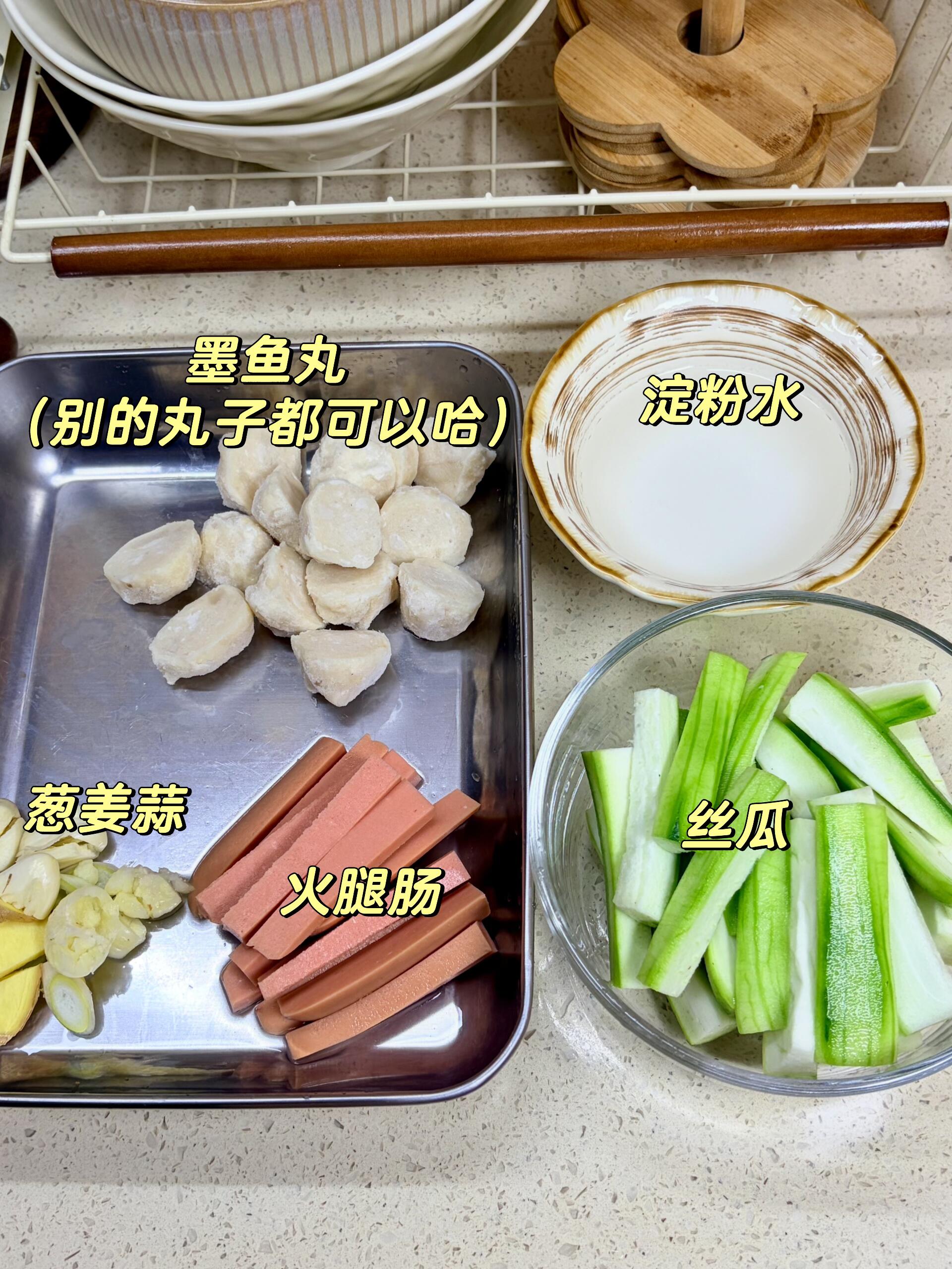 墨鱼丸(可替换成任意喜欢的丸子)、葱姜蒜、火腿肠、丝瓜、淀粉水
