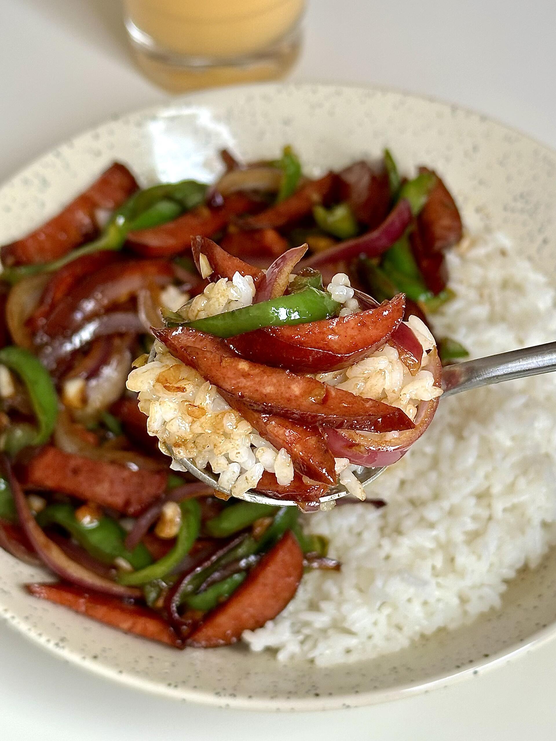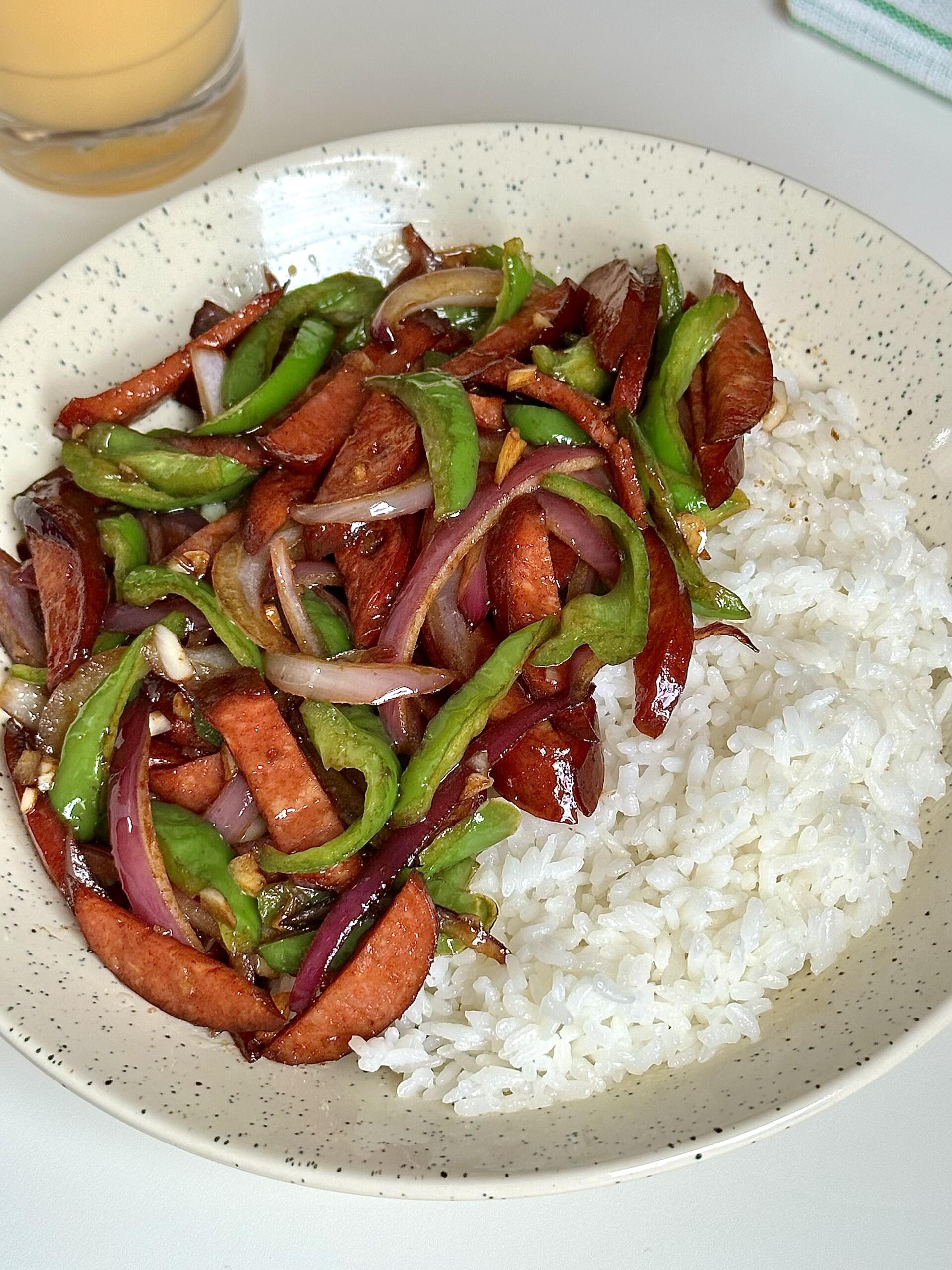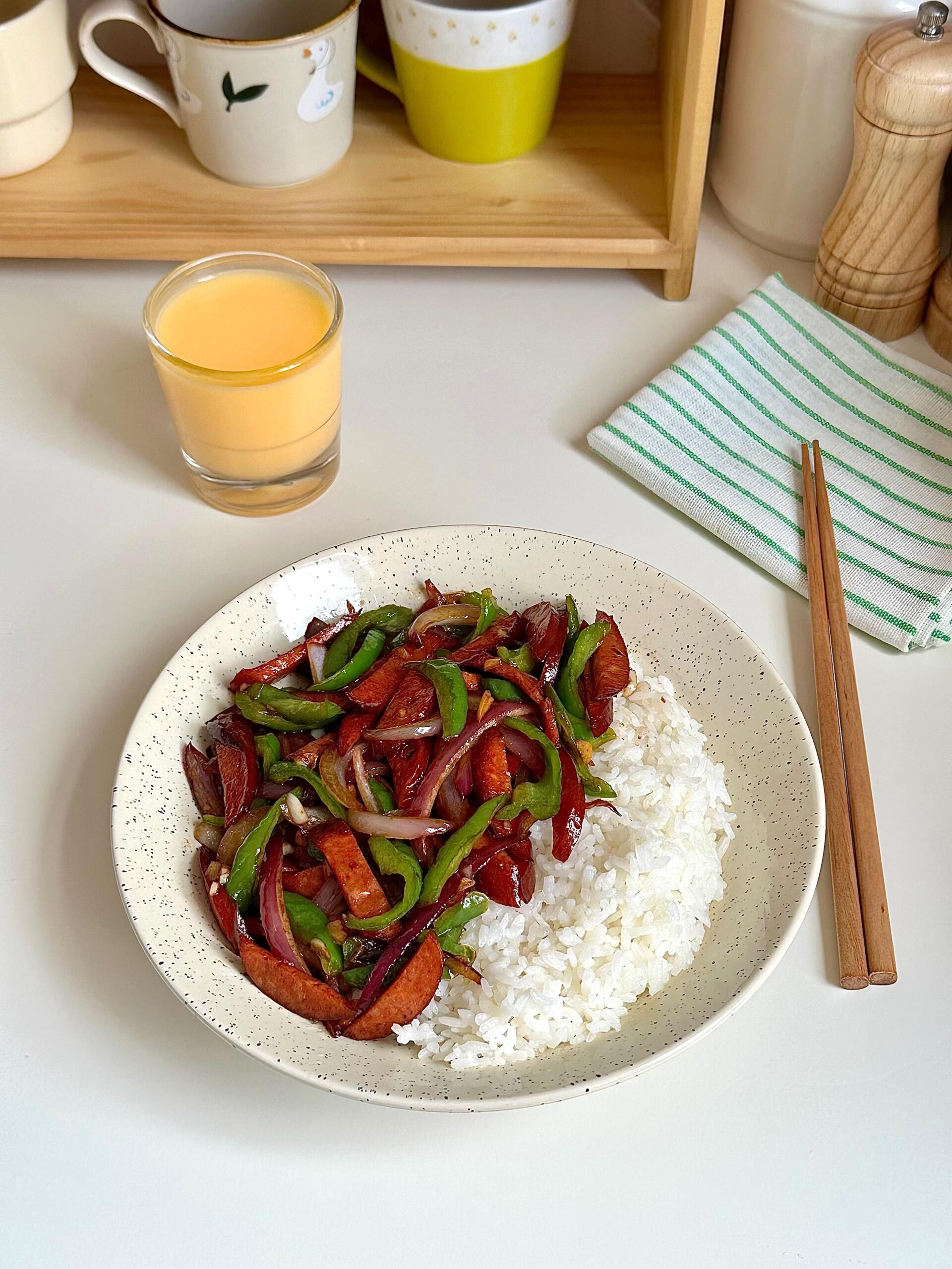香肠自带的咸香,中和了青椒的清爽和洋葱的清甜,不腻不齁,每一口都有层次,家常感拉满,不管是配米饭还是单独吃,都超合适,妥妥的家常下饭菜天花板