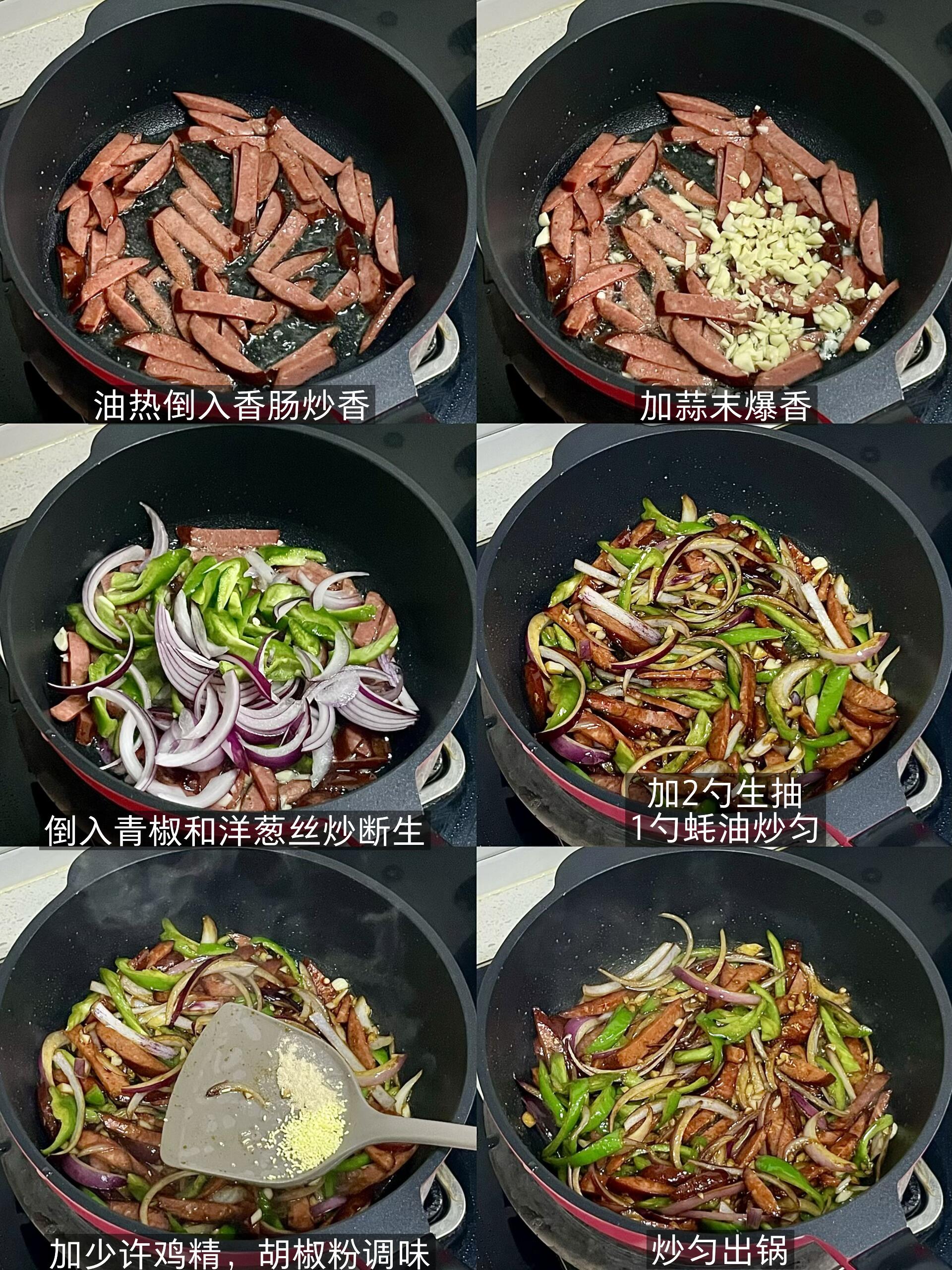 📝 食材(极简好备):香肠、青椒、洋葱、蒜末、生抽、蚝油、鸡精、白胡椒粉📝 详细做法: