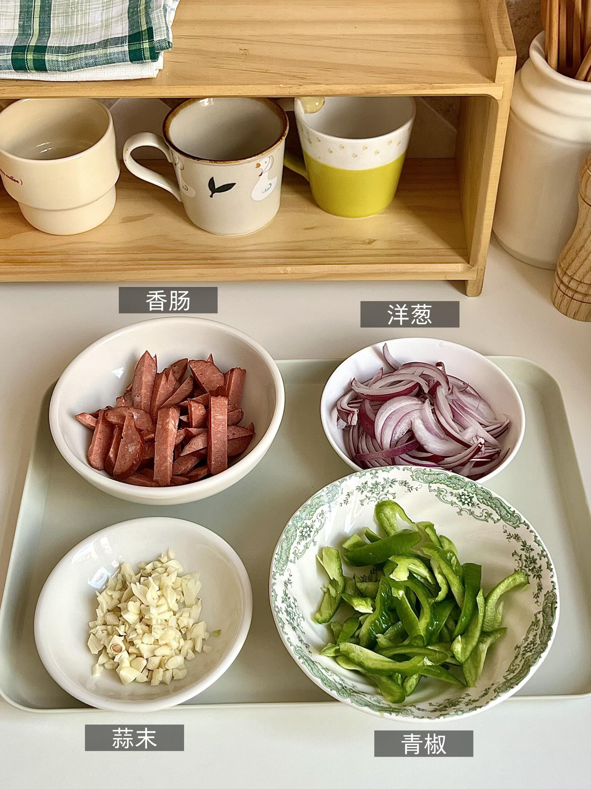 香肠斜切成薄片,青椒、洋葱分别切成丝,蒜末备好,无需复杂处理,家常做法更省心;