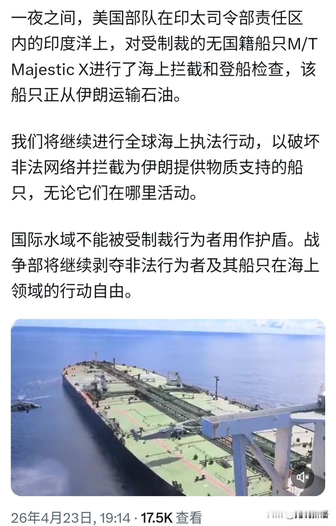 4月23日,伊朗议会副议长高兴地宣布他们今天收到了第一笔霍尔木兹海峡过路费,这笔资金已经纳入公共预算之中。这对于他们来说确实是一个好的开端,对于其战后重建会起到很大帮助。然而与此同时,距离伊朗数千公里外的印度洋,一艘由伊朗运营的无国籍超大型油轮MAJESTICS号被美军扣押,它被认为是“影子舰队”的一员。这艘28万吨的巨轮可一次性运输200多万桶原油,据称它正满载驶向目的地。不算油轮本身,仅200万桶原油价值就超过1.5亿美元,数百万美元的通行费与它比起来就像是芝麻和西瓜的区别。由于遍布世界各地的军事基地和多年的全球作战经验,美军在各大洋具备得天独厚的优势。未来更多位于公海上的伊朗船只很可能还会被陆续扣押,而他们折腾这么久才刚收到第一笔过路费,很显然损失和收入是很难成正比的,继续维持现状撑不下去的大概率是伊朗,若想破局只有想方设法在其他方向打开突破口。