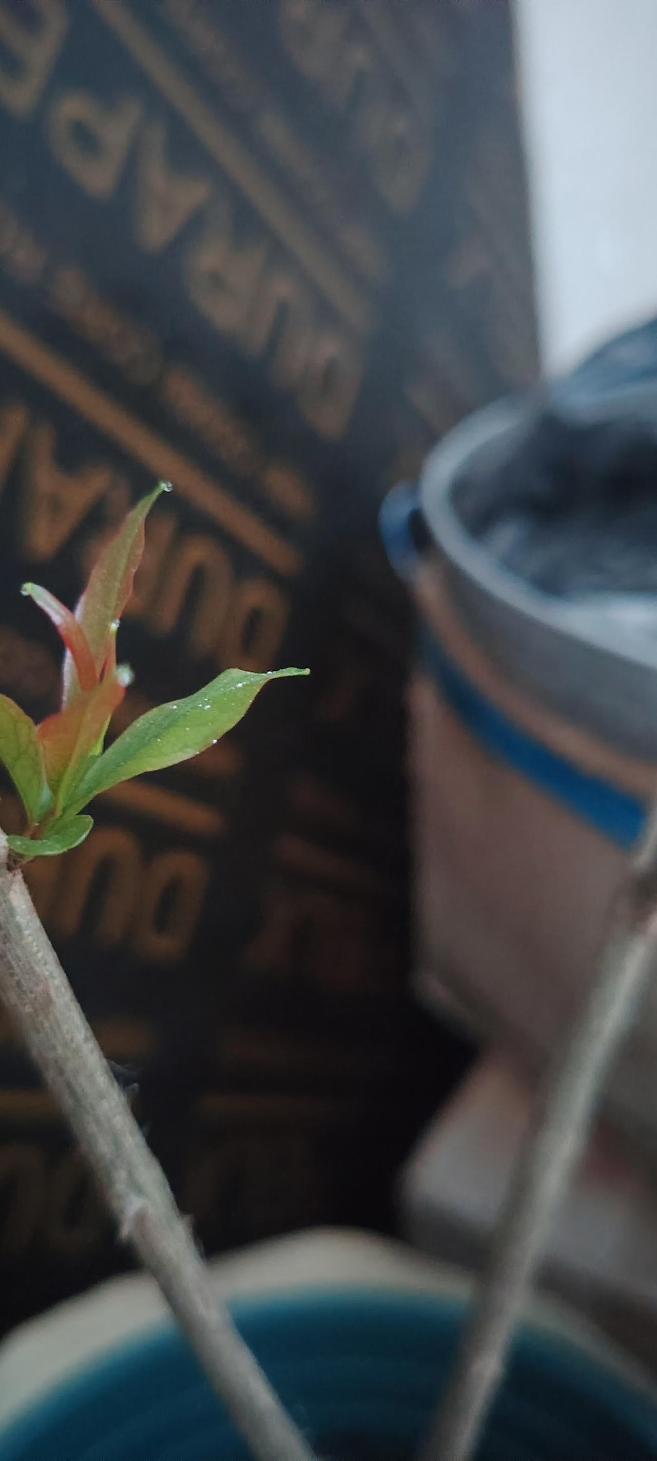 今天又长见识了:石榴泌蜜。前几天发现石榴叶尖有晶莹剔透的小水珠,还以为是哪个给石榴苗浇水了。今天我一直在家,没任何人给石榴浇水,而且中午时分石榴叶还蔫了,明显缺水状态,就搬进屋里,等到傍晚浇水。傍晚6点移出石榴,发现它的几片新叶上有针尖大的水珠,肯定不是露珠。我还在发痴:难道树苗在哭泣求救吗?恍惚之下,想到豆包,豆包告诉我:这叫石榴泌蜜,正常现象,可保留,利于吸引益虫,新叶期常见。