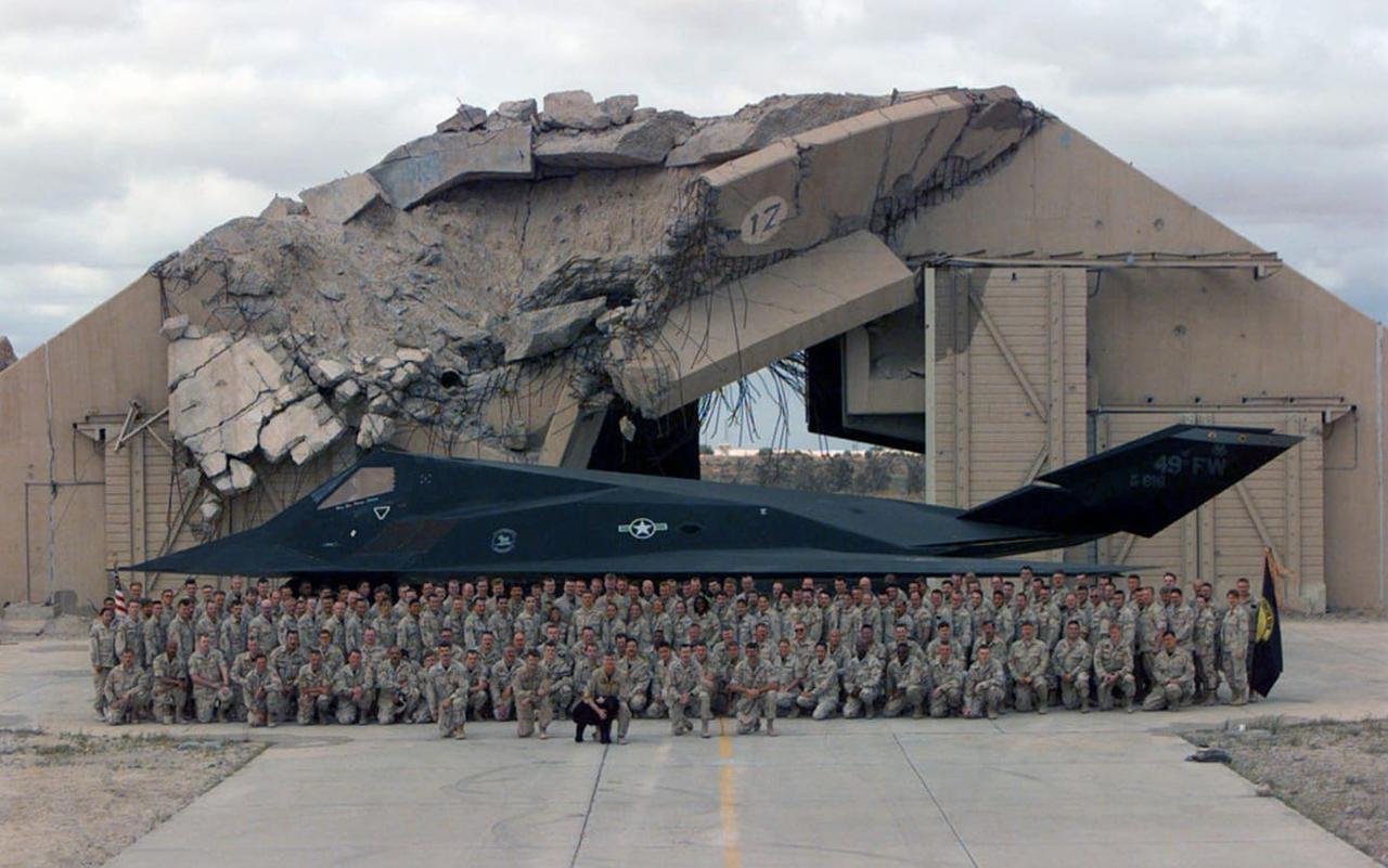 1998年“南方守望行动”期间,驻扎在科威特艾哈迈德·贾比尔空军基地的第49战斗机联队第8战斗机中队的成员在被炸毁的加固飞机掩体和一架F-117A“隐形战斗机”前合影。