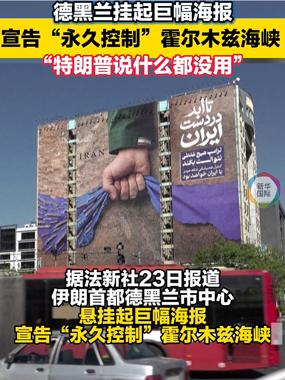 另据新华社援引法新社23日报道,伊朗首都德黑兰市中心悬挂起巨幅海报,宣告“永久控制”霍尔木兹海峡。