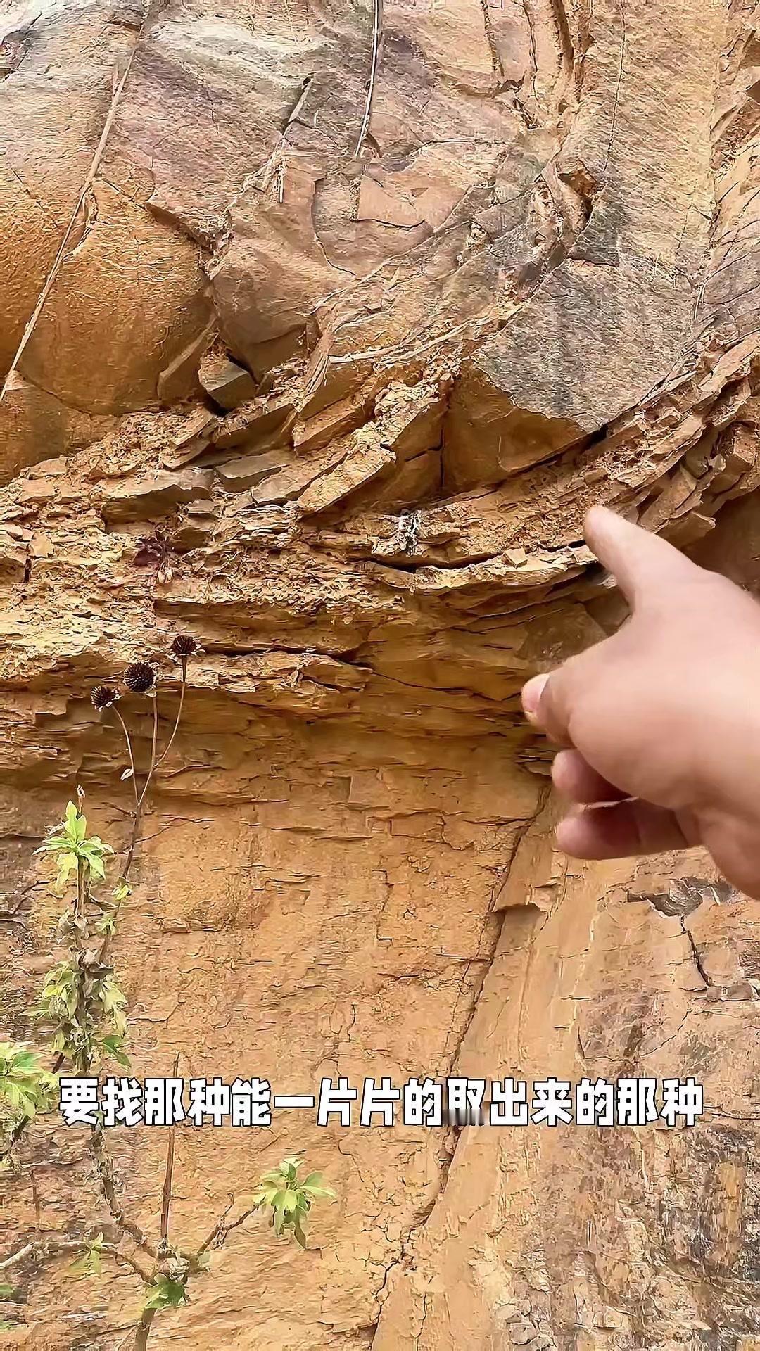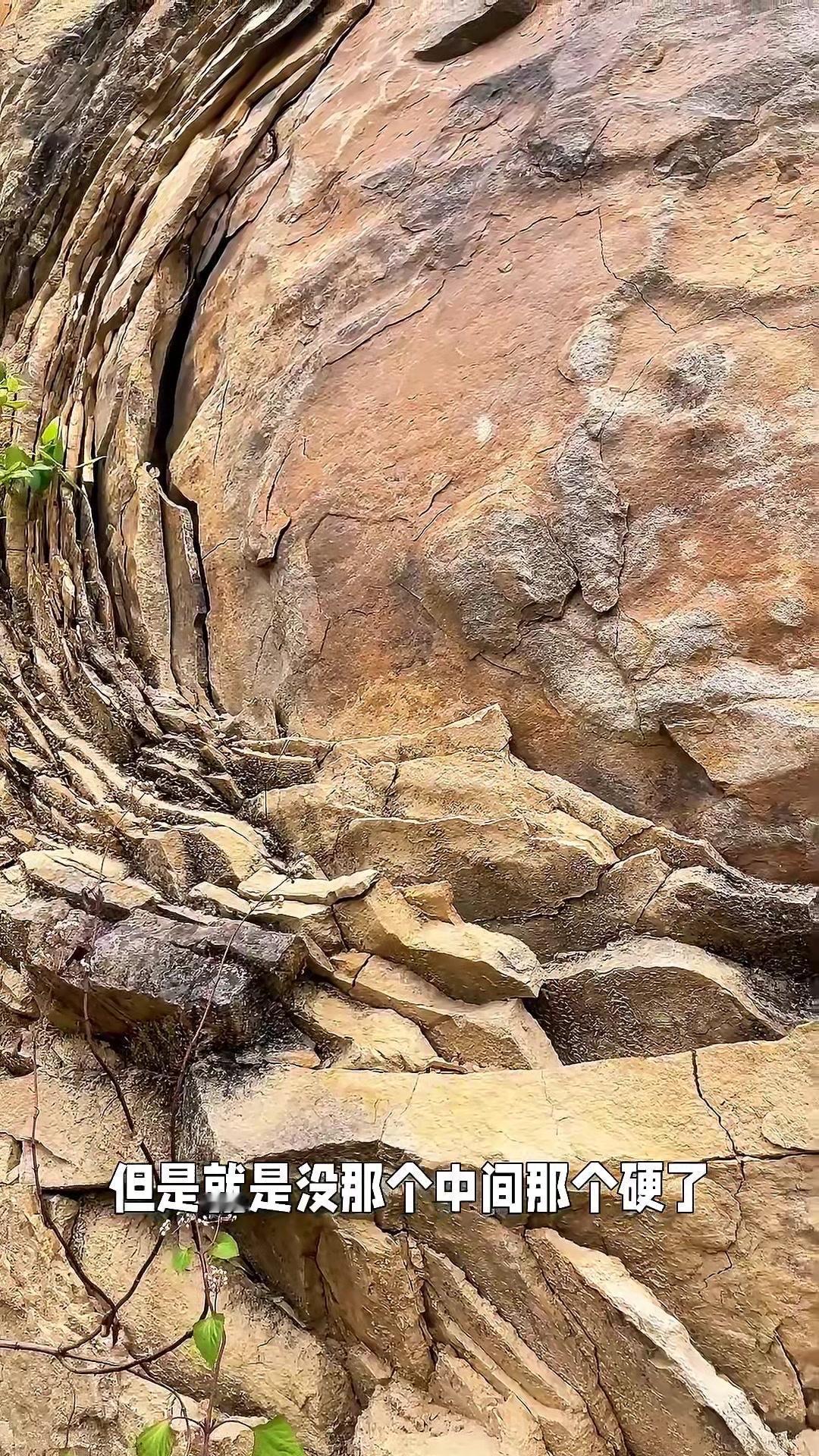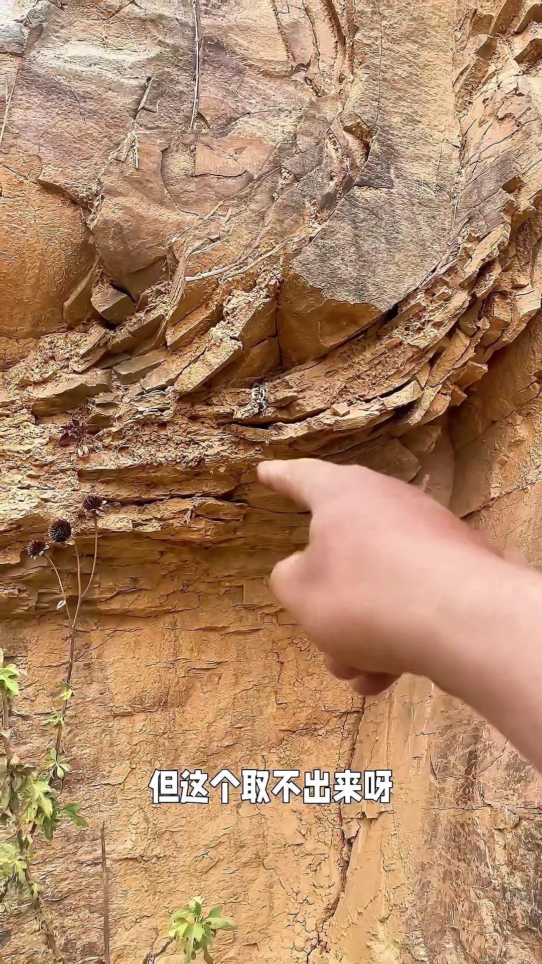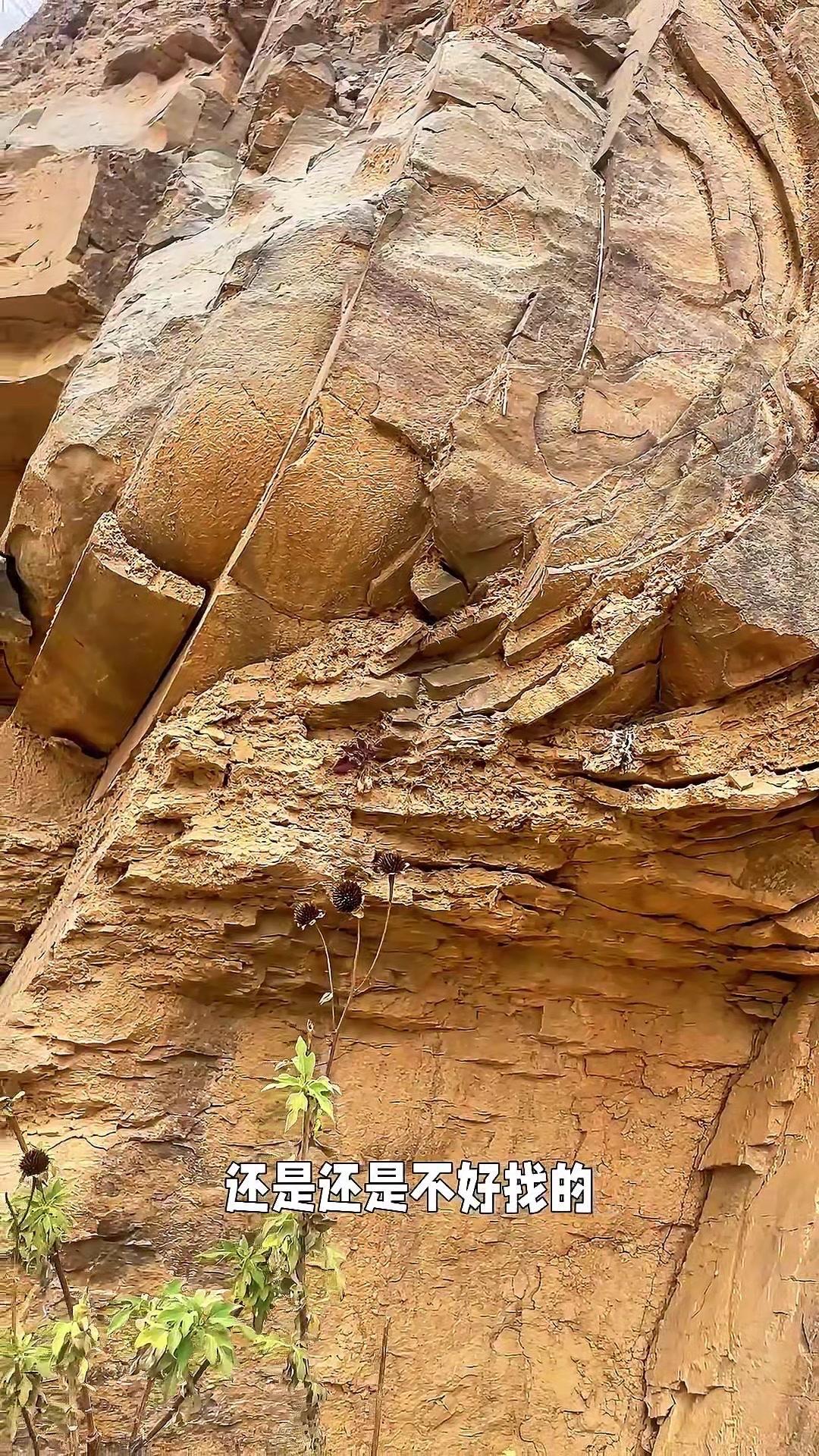 3️⃣悬崖探秘:看到一个悬崖,都是橙色页岩层,虽有洞但中间硬内核,取不出半圆壳。