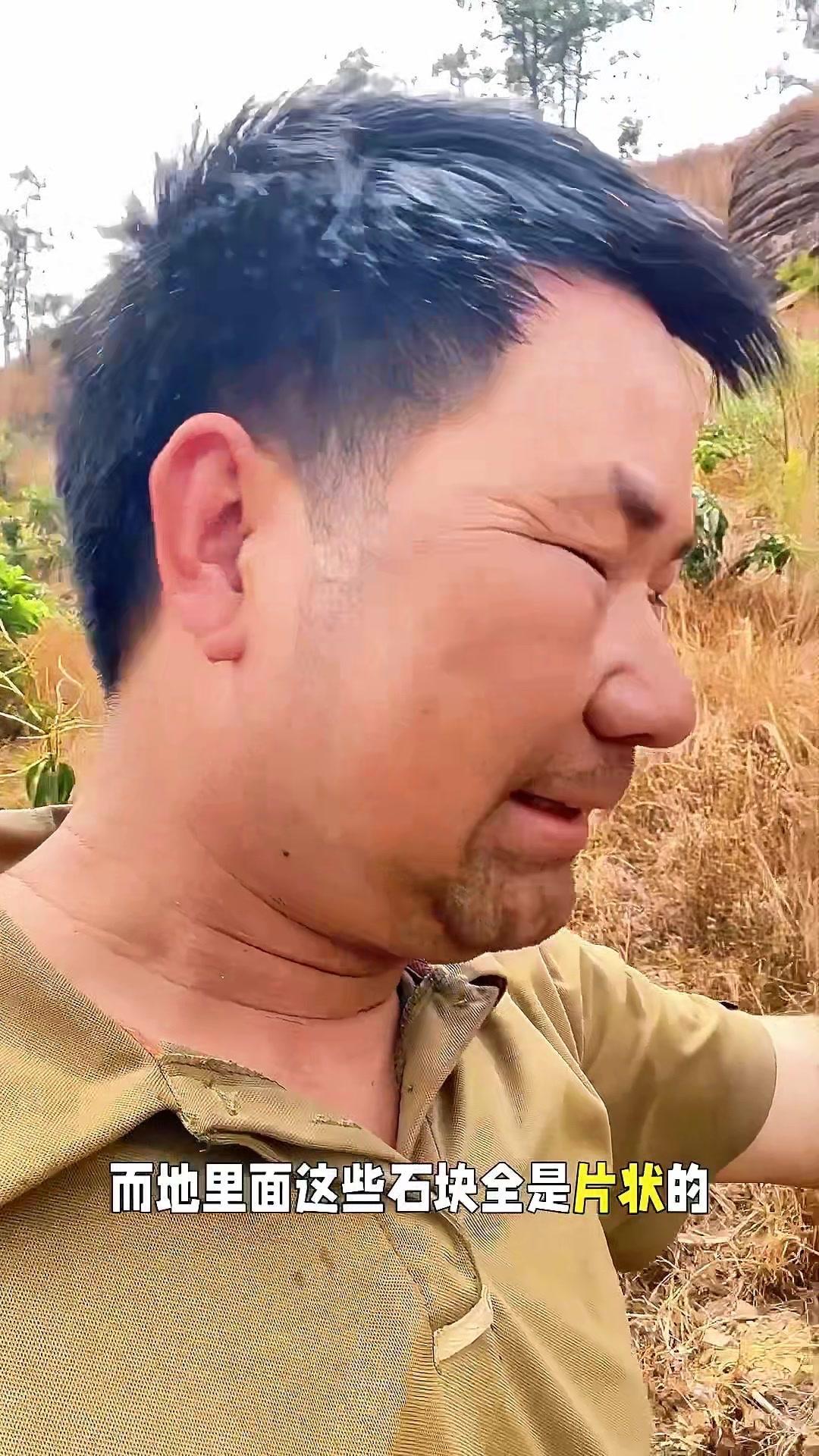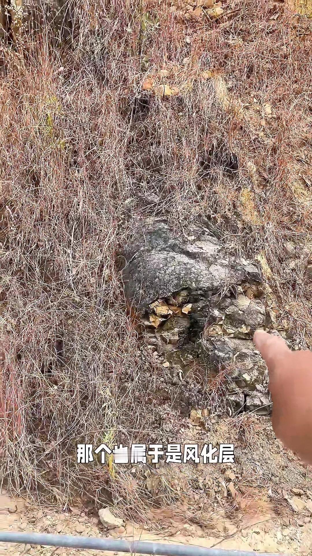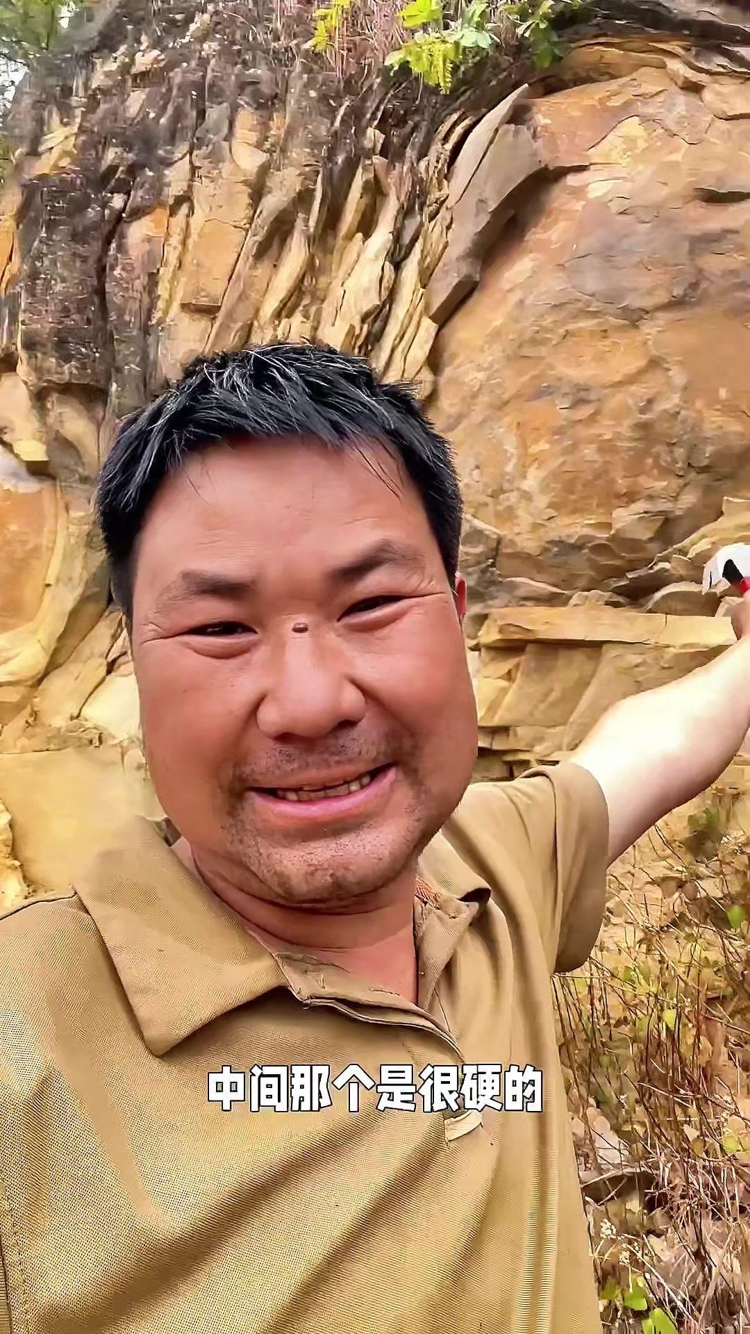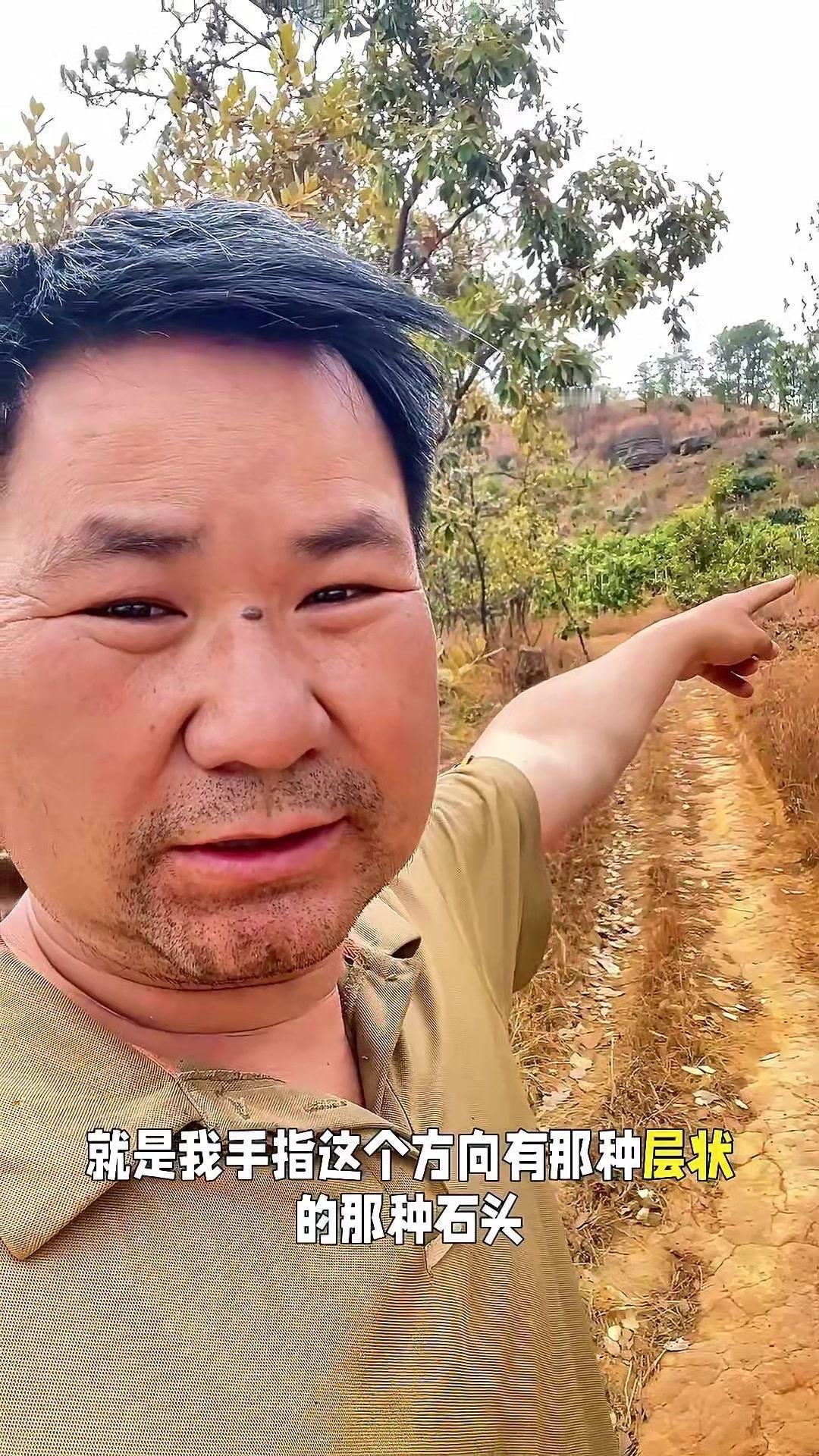 1️⃣寻石路上:出发后沿着路上的风化层找,看到很多圆蛋状的风化石,但大多没形成那种薄壳形状,不符合要求。继续深入山区里层状石头多,这片芒果地挖出的石头也呈片状,近距离看层理分明,中间内核是花岗岩很坚硬,剥壳时一剥就掉,很难取出合适的。