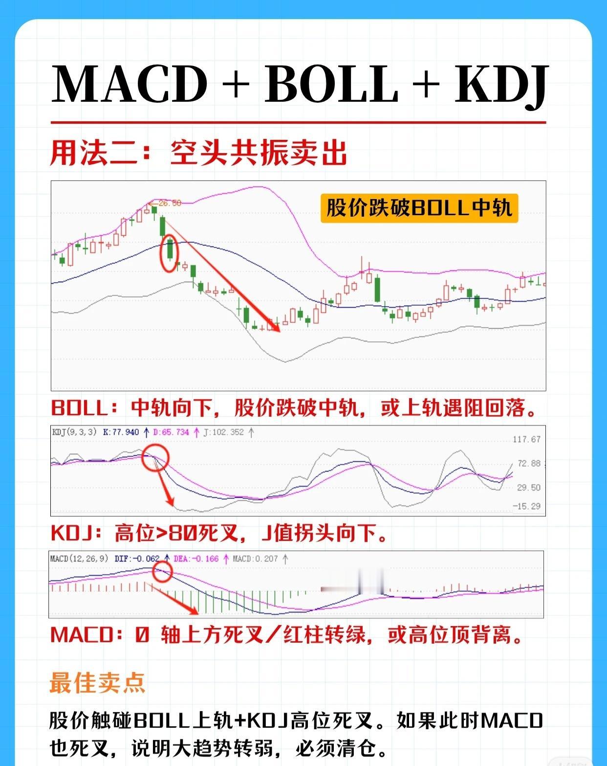 股价触碰BOLL上轨 + KDJ高位死叉,若此时MACD也同步死叉,说明大趋势转弱,立即清仓。
