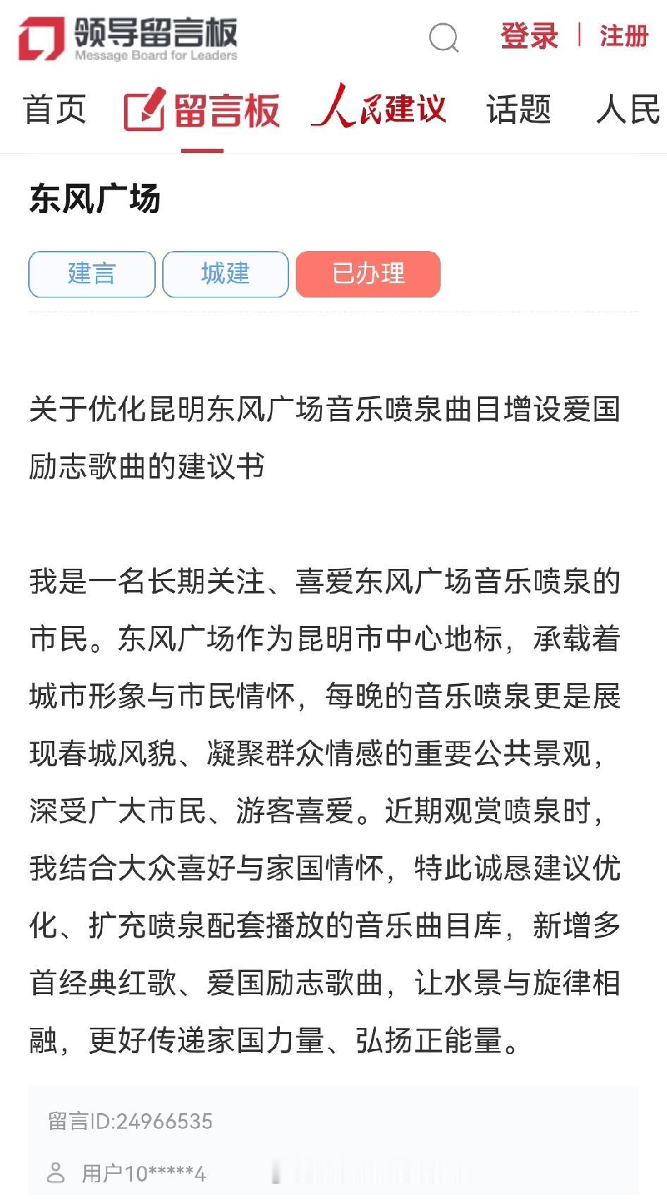 🎼有网民留言建议优化广场音乐喷泉曲目,增设爱国励志歌曲。这提议很棒!广场本就承载着昆明人的精神坐标意义,播放爱国励志歌曲能进一步激发大家的爱国情怀,让广场的文化氛围更浓厚。