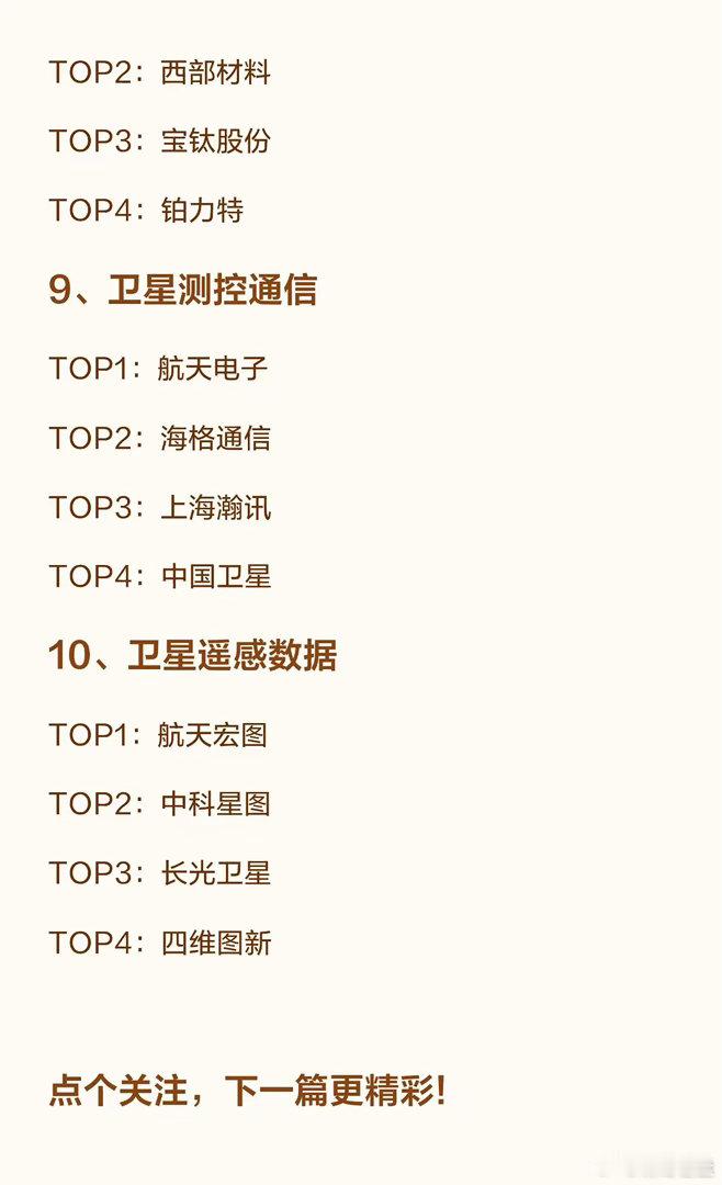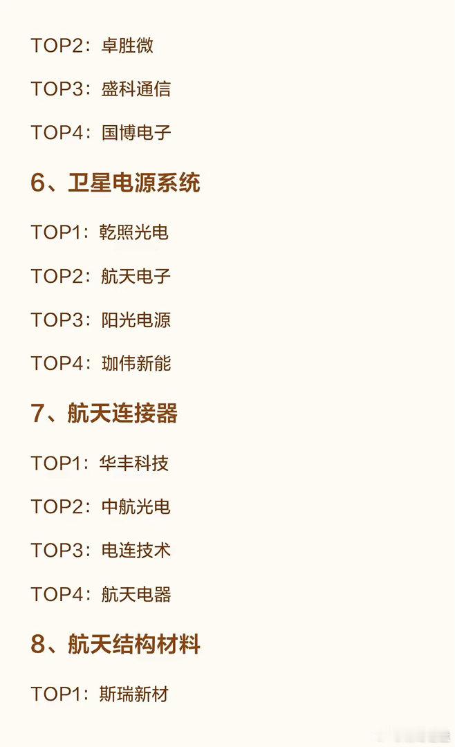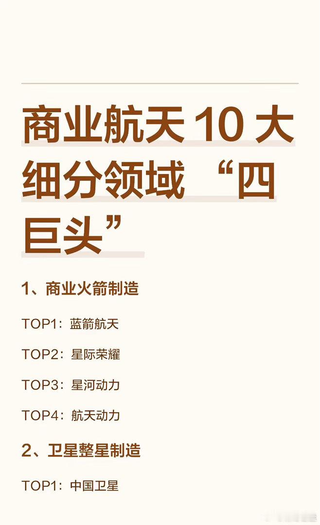 商业航天 10 大细分领域 “四巨头”1、商业火箭制造TOP1:蓝箭航天TOP2:星际荣耀TOP3:星河动力TOP4:航天动力2、卫星整星制造TOP1:中国卫星TOP2:银河航天TOP3:长光卫星TOP4:时空道宇3、卫星通信运营TOP1:中国卫通TOP2:中国星网TOP3:航天宏图TOP4:中科星图4、火箭发动机TOP1:航天动力TOP2:蓝箭航天TOP3:星际荣耀TOP4:西安航天发动机5、星载射频芯片TOP1:铖昌科技TOP2:卓胜微TOP3:盛科通信TOP4:国博电子6、卫星电源系统TOP1:乾照光电TOP2:航天电子TOP3:阳光电源TOP4:珈伟新能7、航天连接器TOP1:华丰科技TOP2:中航光电TOP3:电连技术TOP4:航天电器8、航天结构材料TOP1:斯瑞新材TOP2:西部材料TOP3:宝钛股份TOP4:铂力特9、卫星测控通信TOP1:航天电子TOP2:海格通信TOP3:上海瀚讯TOP4:中国卫星10、卫星遥感数据TOP1:航天宏图TOP2:中科星图TOP3:长光卫星TOP4:四维图新