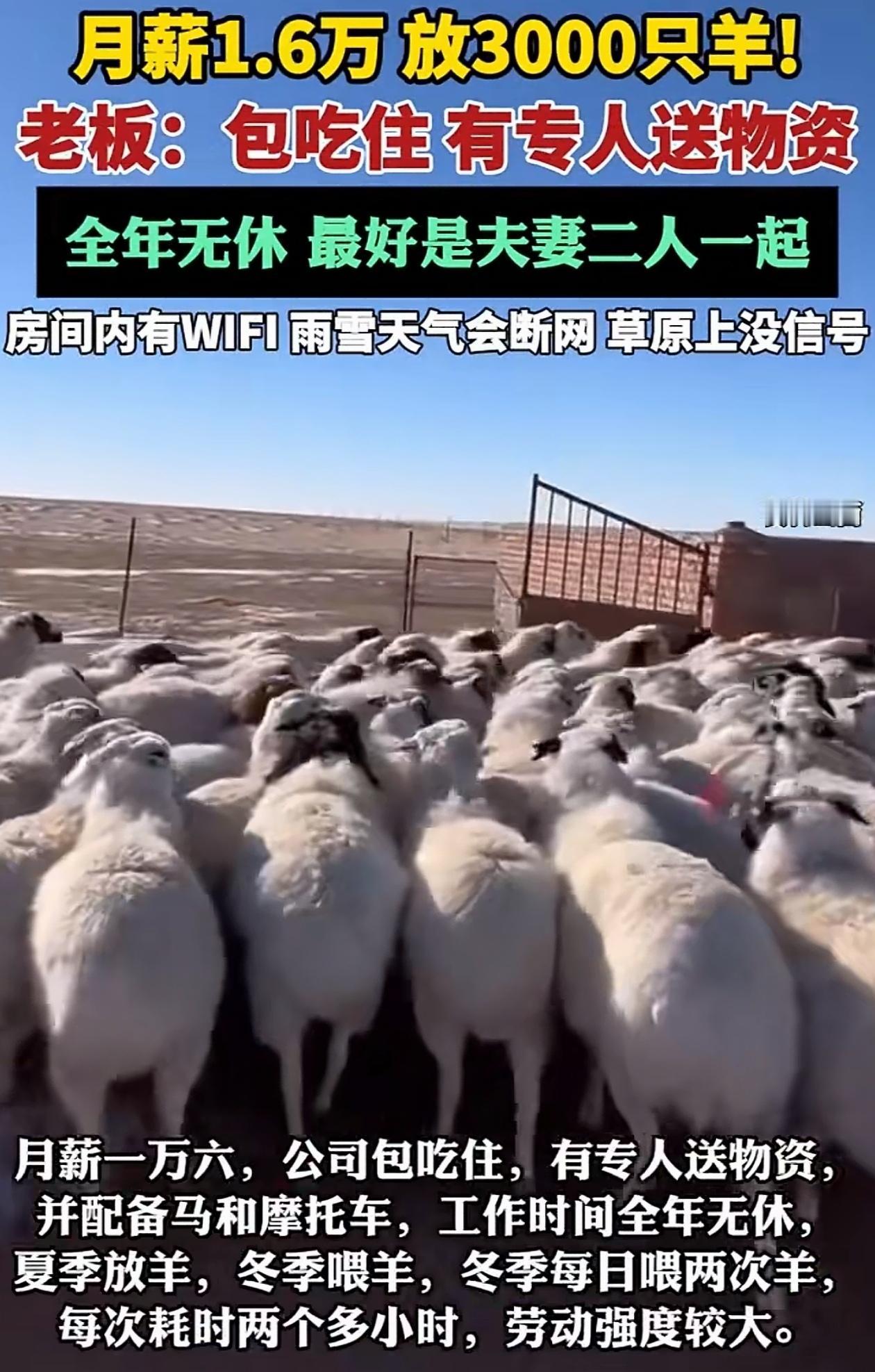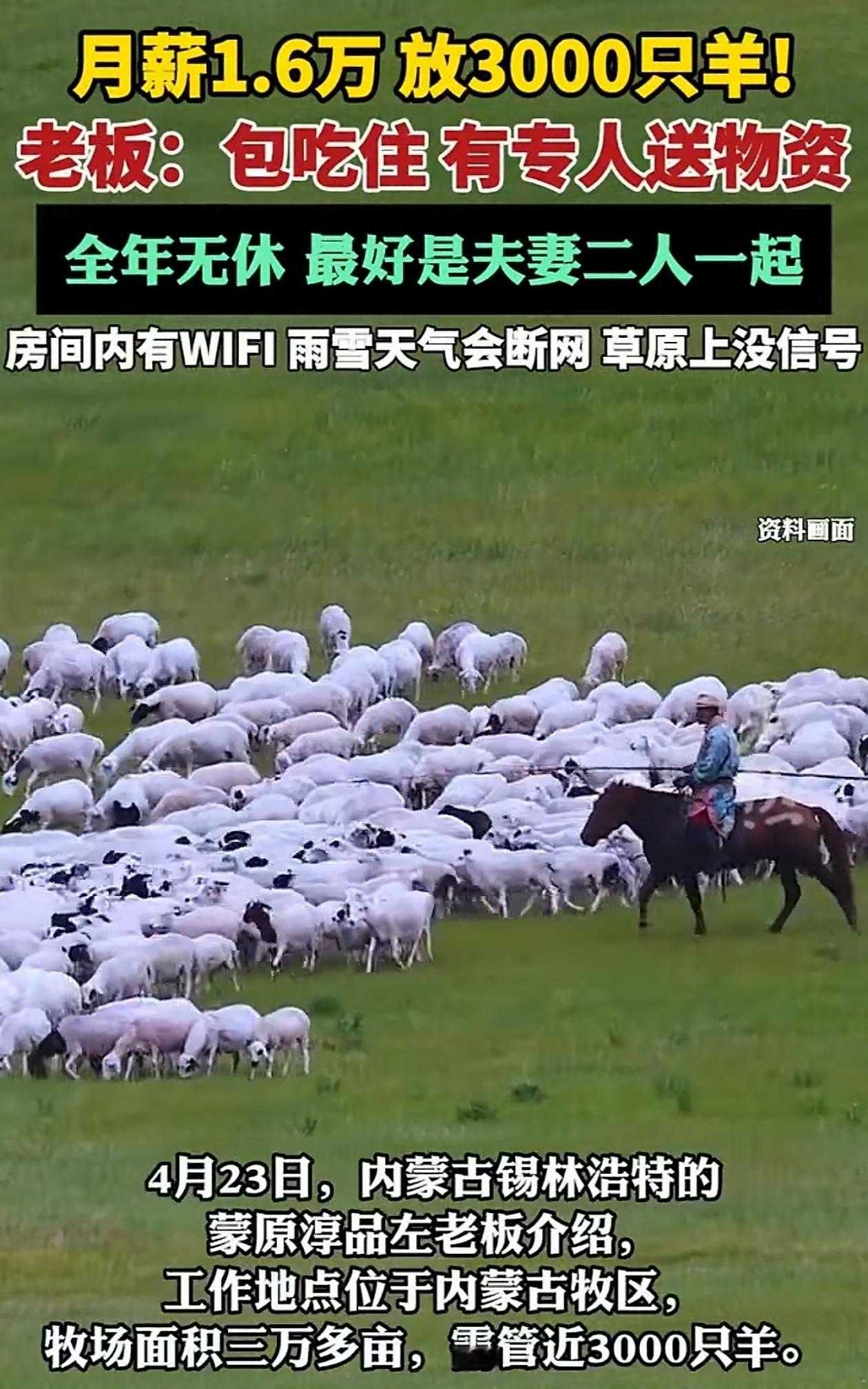 “这个工作火了!”内蒙古锡林浩特一老板开出1万6的月薪,包吃包住都招不到人!工作内容并不复杂,他有一个3万多亩的牧区,里面养了差不多3000多只羊,急需有人帮他照看。