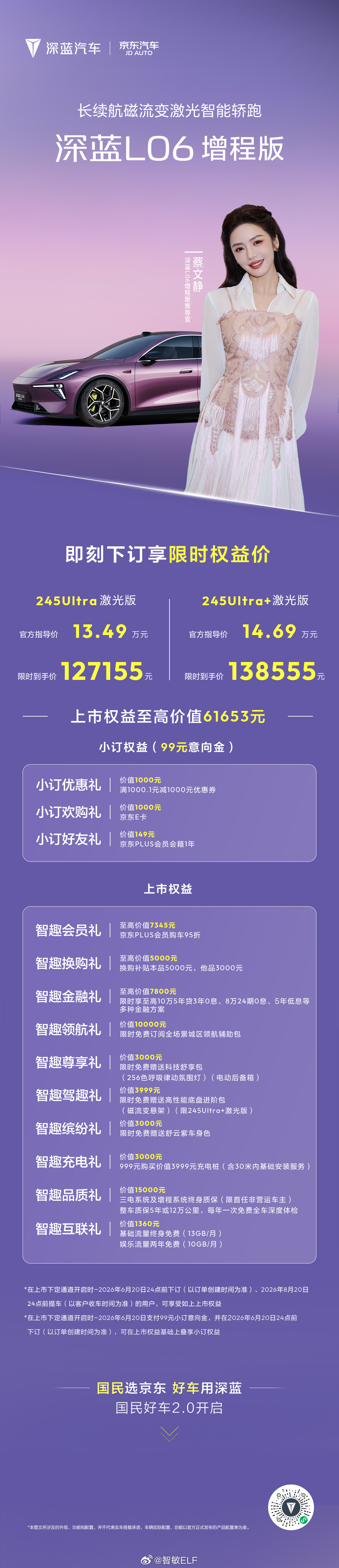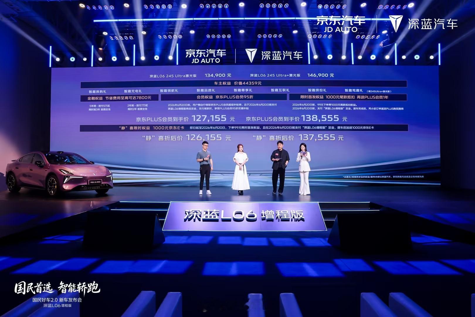 关键这次价格也很给力,叠加权益到手价12.71万-13.85万,这个价格也还是走的亲民路线,而且给的配置还相当不错。对了!深蓝和京东还给大家送了份福利,购车还送1000元京东E卡,这羊毛得薅啊深蓝L06增程版国民好车2.0