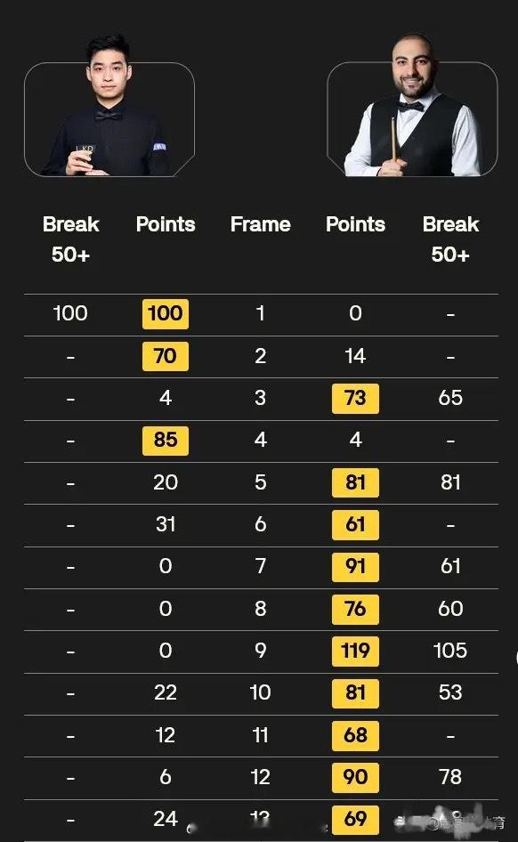 全场数据统计显示,瓦菲打出来看一杆破百和7杆50+,斯佳辉打出单杆100分,瓦菲在接下来将对阵特鲁姆普。虽然说斯佳辉输给瓦菲不算特别大的冷门,甚至在情理之中,然而遭遇9连鞭、3-10的惨败,还是有些让人没有想到的,斯佳辉本赛季的状态真是糟糕。