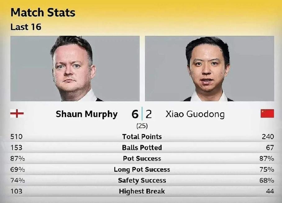 墨菲气定神闲,连解七杆虽然扣了28分,但不漏球,而肖国栋一杆就解到,但漏成筛子,结果墨菲一杆致胜,这就是全场真实写照。