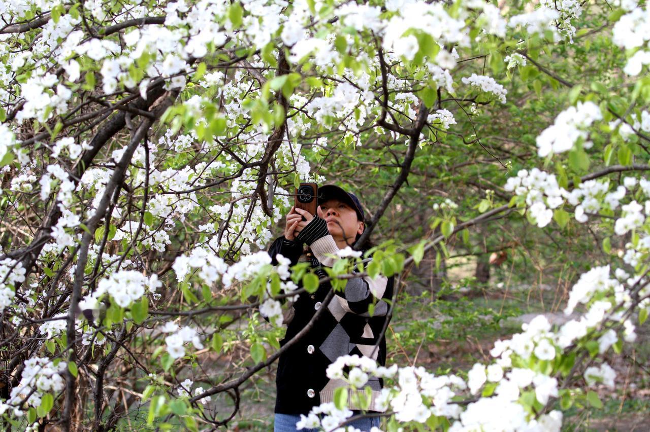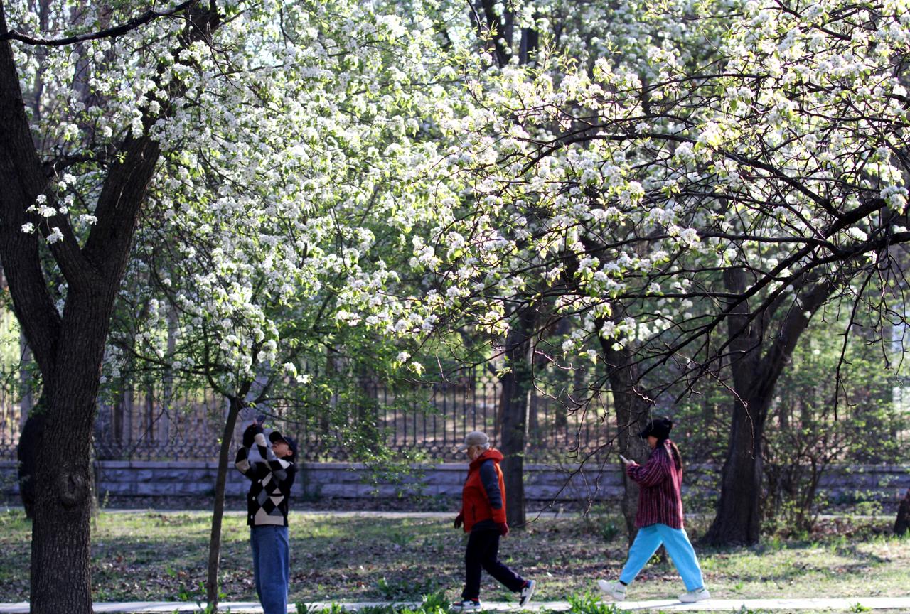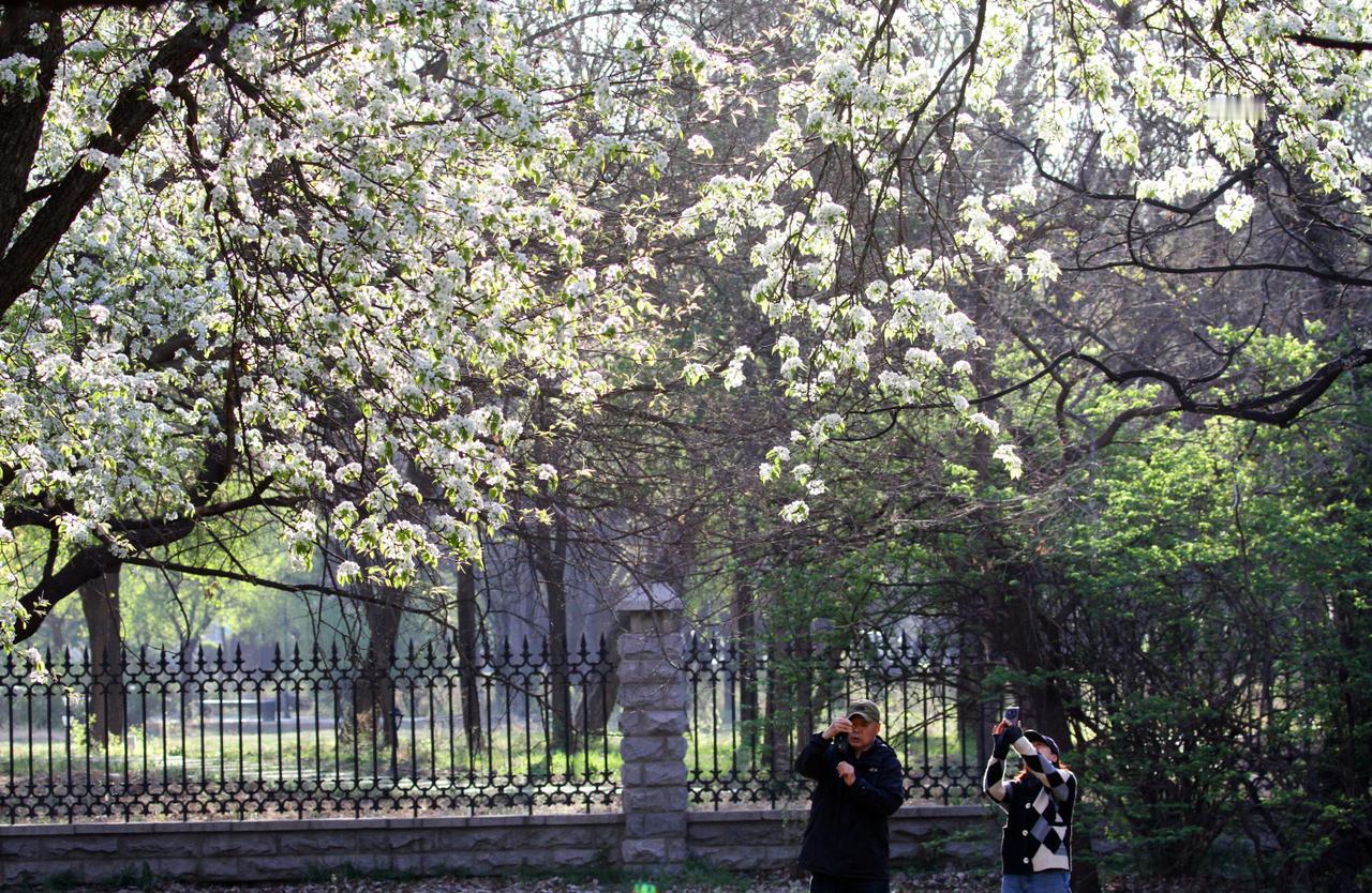 2026年4月23日,辽宁沈阳,在北陵公园里,几棵百年老梨树梨花盛开,洁白如雪的梨花开滿枝头,美不胜收,吸引游人观赏拍照。