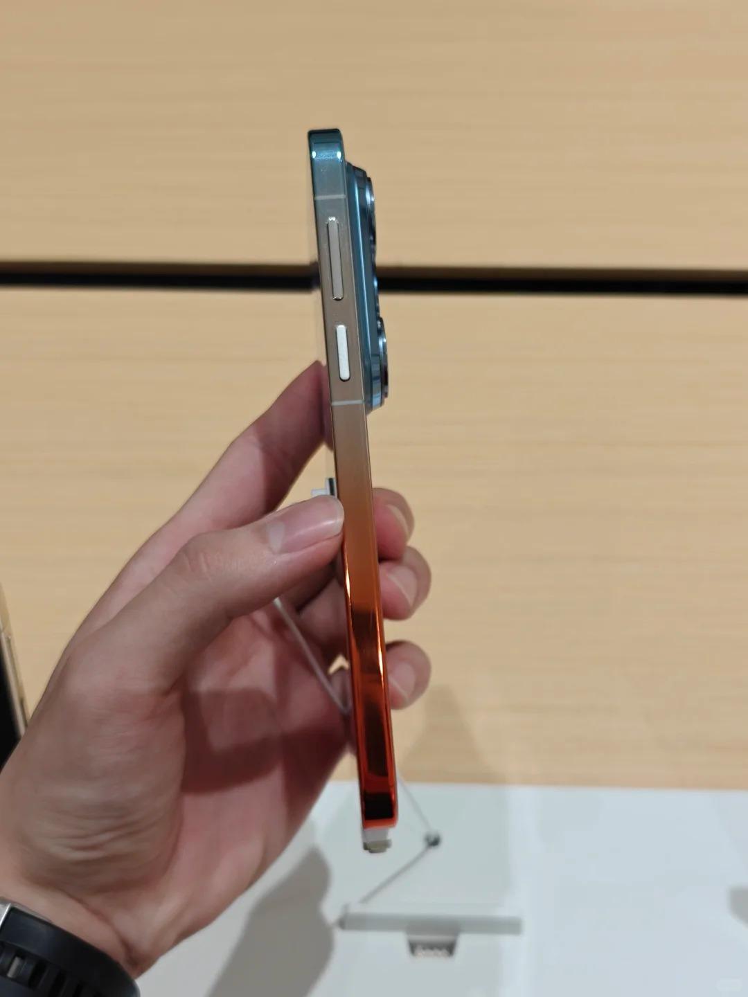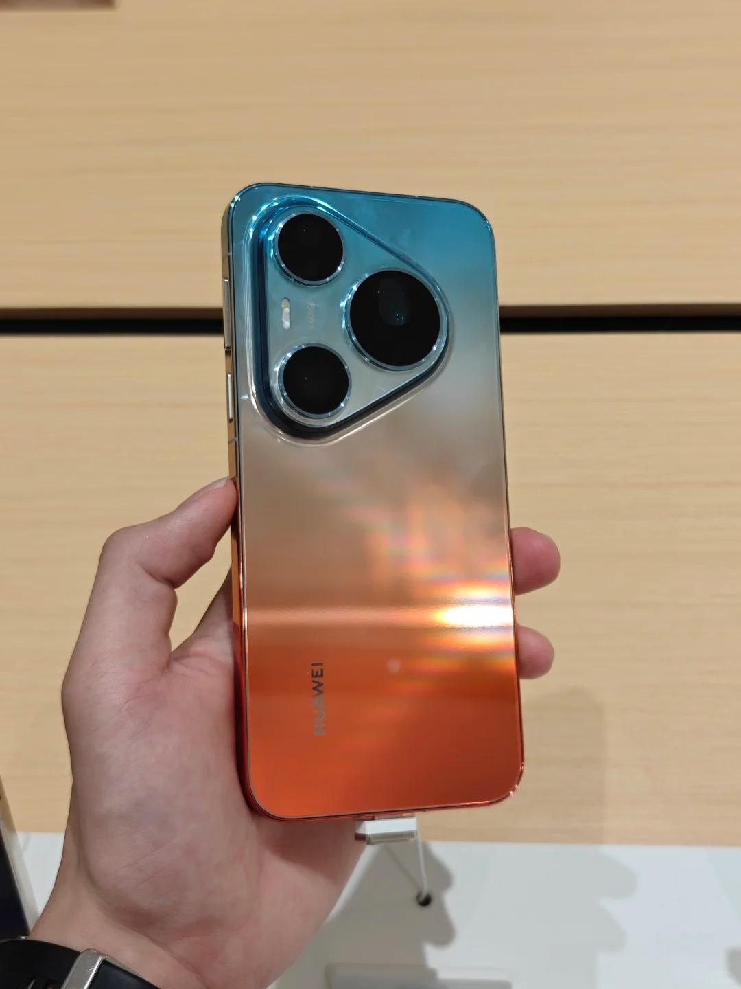 没想到Pura90pm的真机是长这样的,后盖材质是亮面玻璃,店里的灯照过去,非常闪,而且容易沾指纹,估计店员经常擦手机,不过这个工艺确实厉害,中框也是渐变色。你们觉得好看吗?