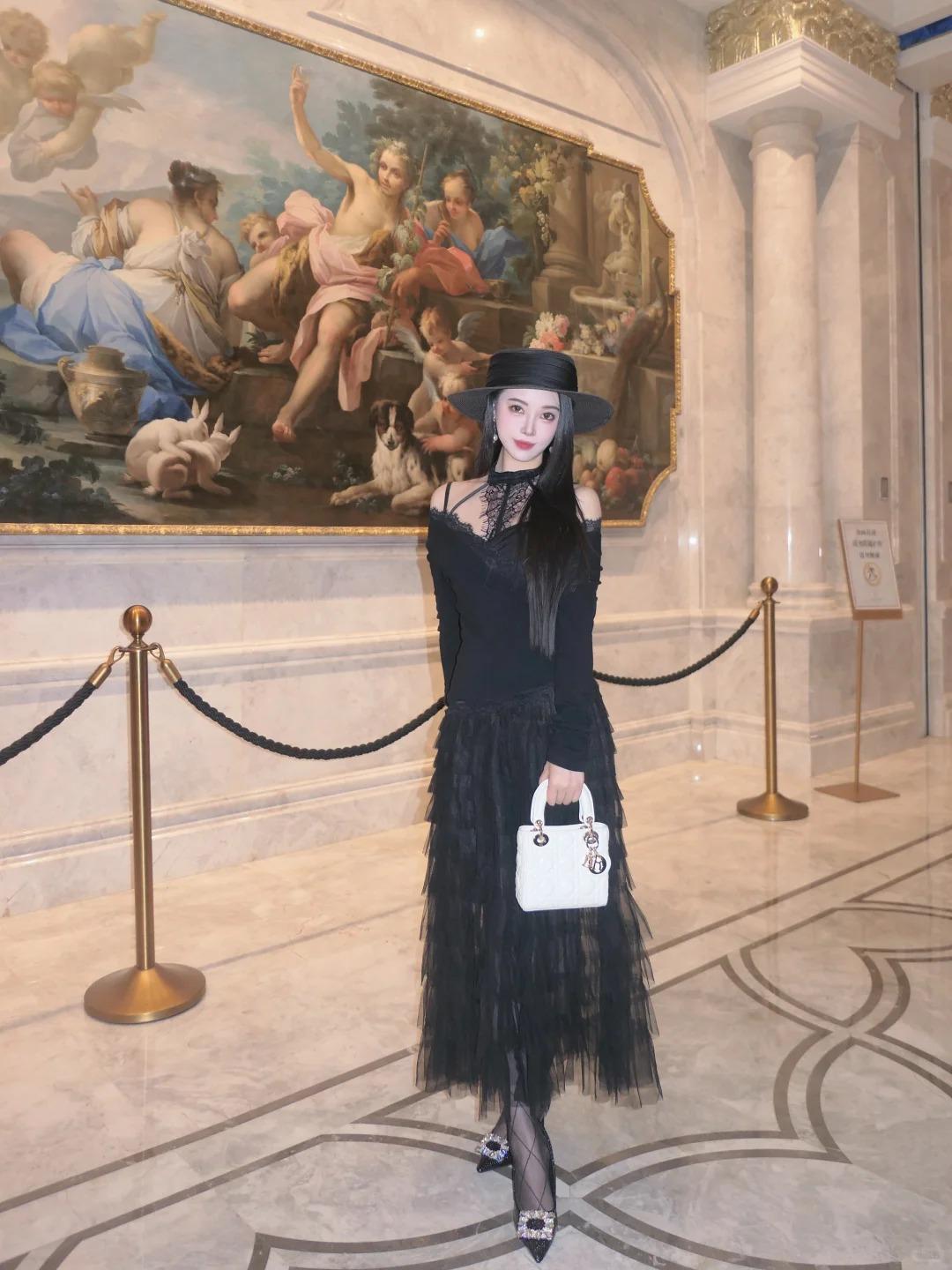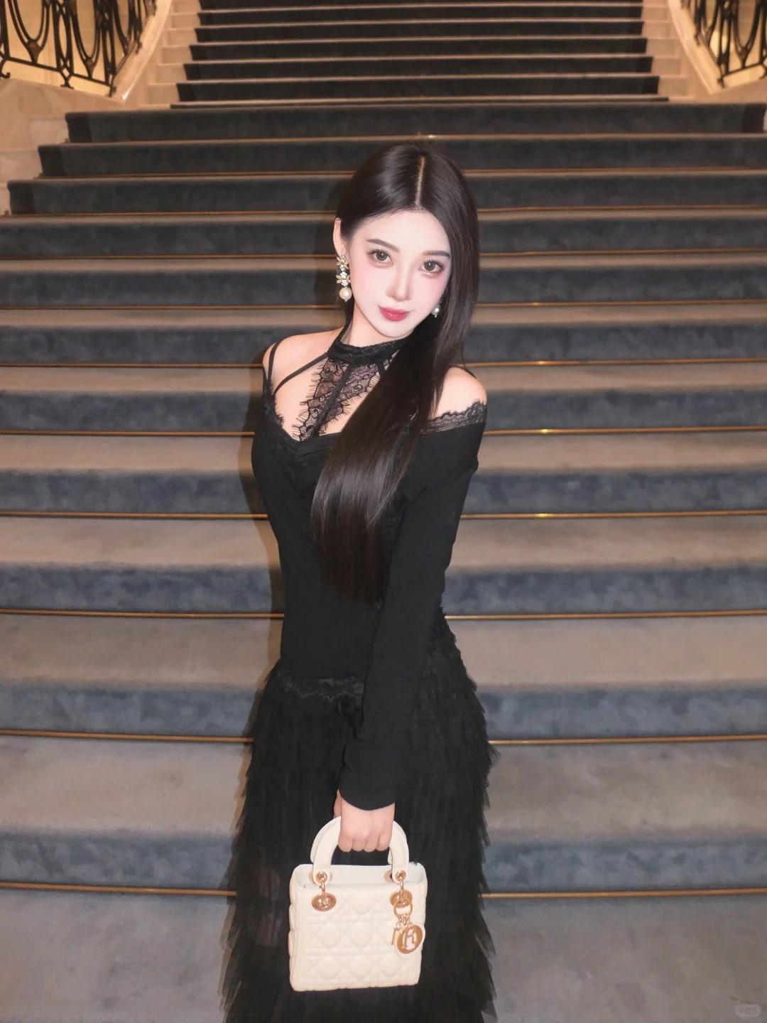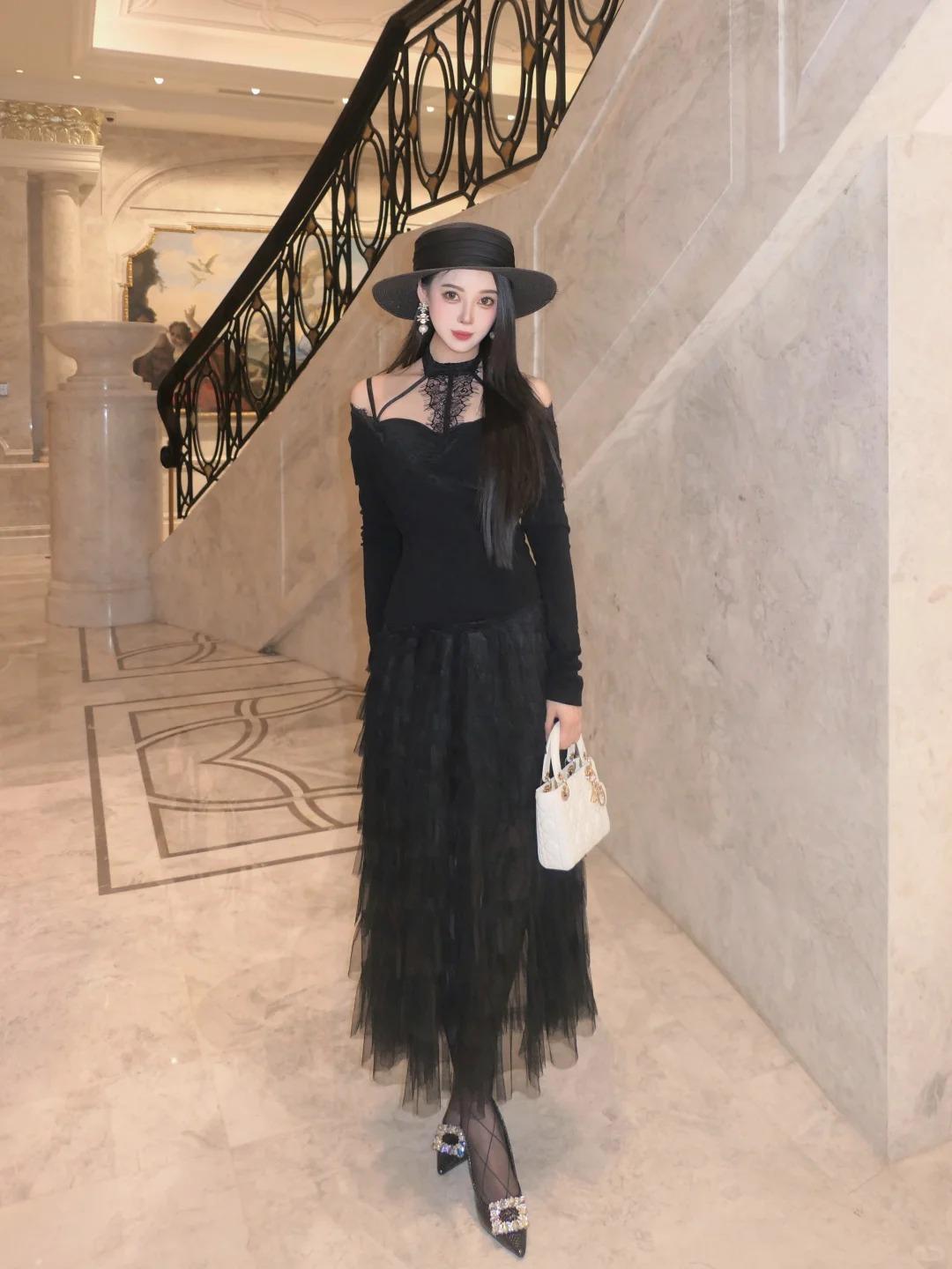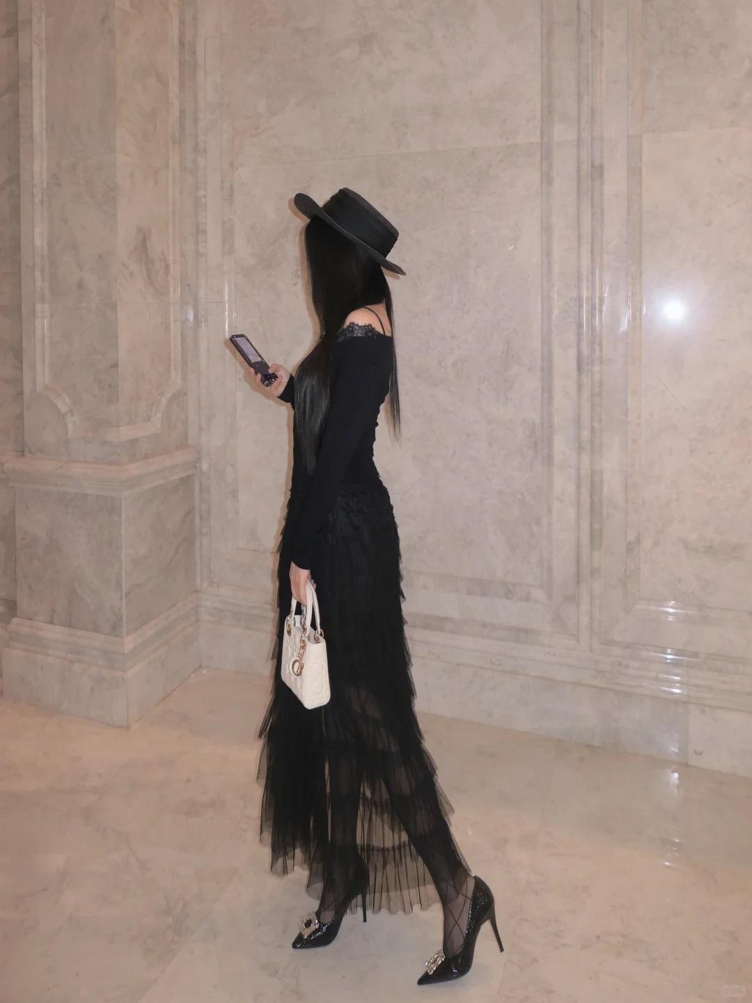 all black 也可以很仙 色系:黑 搭配:黑色蛋糕裙➕菱格黑丝➕方扣高跟鞋。长裙就很显气质