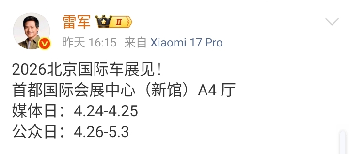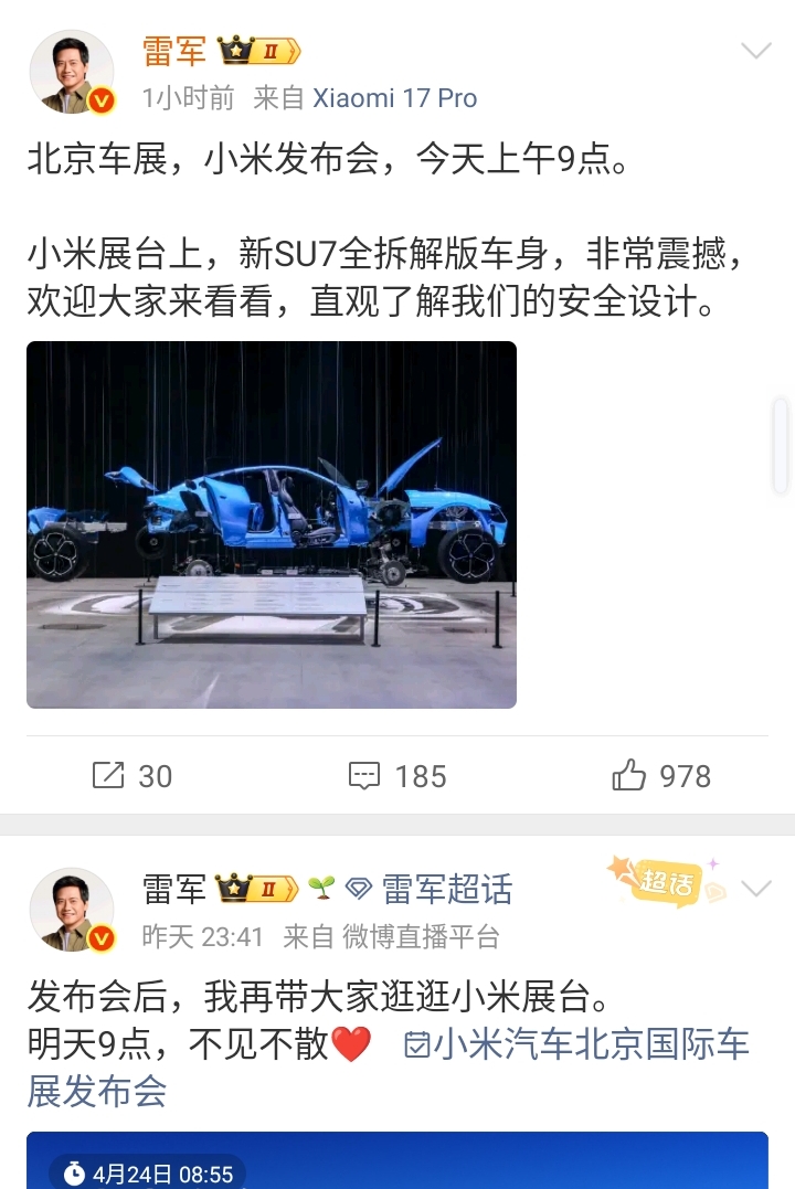 4月24日一大早,雷军就急切地发了一条博文,博文的内容是今天上午9点他将要现身北京车展。实际上,相同的内容他昨天就已经发过2次了!还有,小米汽车副总李肖爽也在前天和昨天为他宣传造势了,就如同举着高分贝的大喇叭兴奋地广播一般:雷总来车展了!雷总要来车展了!