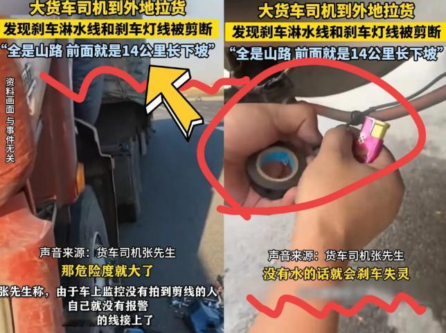 重型货车在此路段必须时刻点刹,全靠淋水线给刹车片降温;淋水线断则刹车失灵,刹车灯线断则后车无法察觉刹车信号,极易引发连环追尾,不仅危及张师傅性命,还会连累过往车辆。