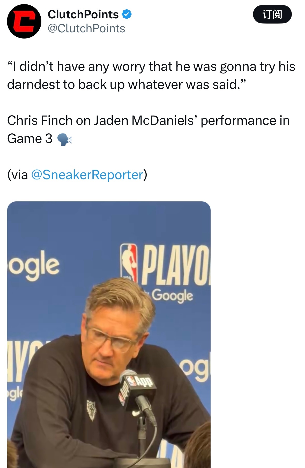 森林狼主教练芬奇:“我丝毫都不担心,麦丹一定会拼尽全部力气,用场上表现去回应外界