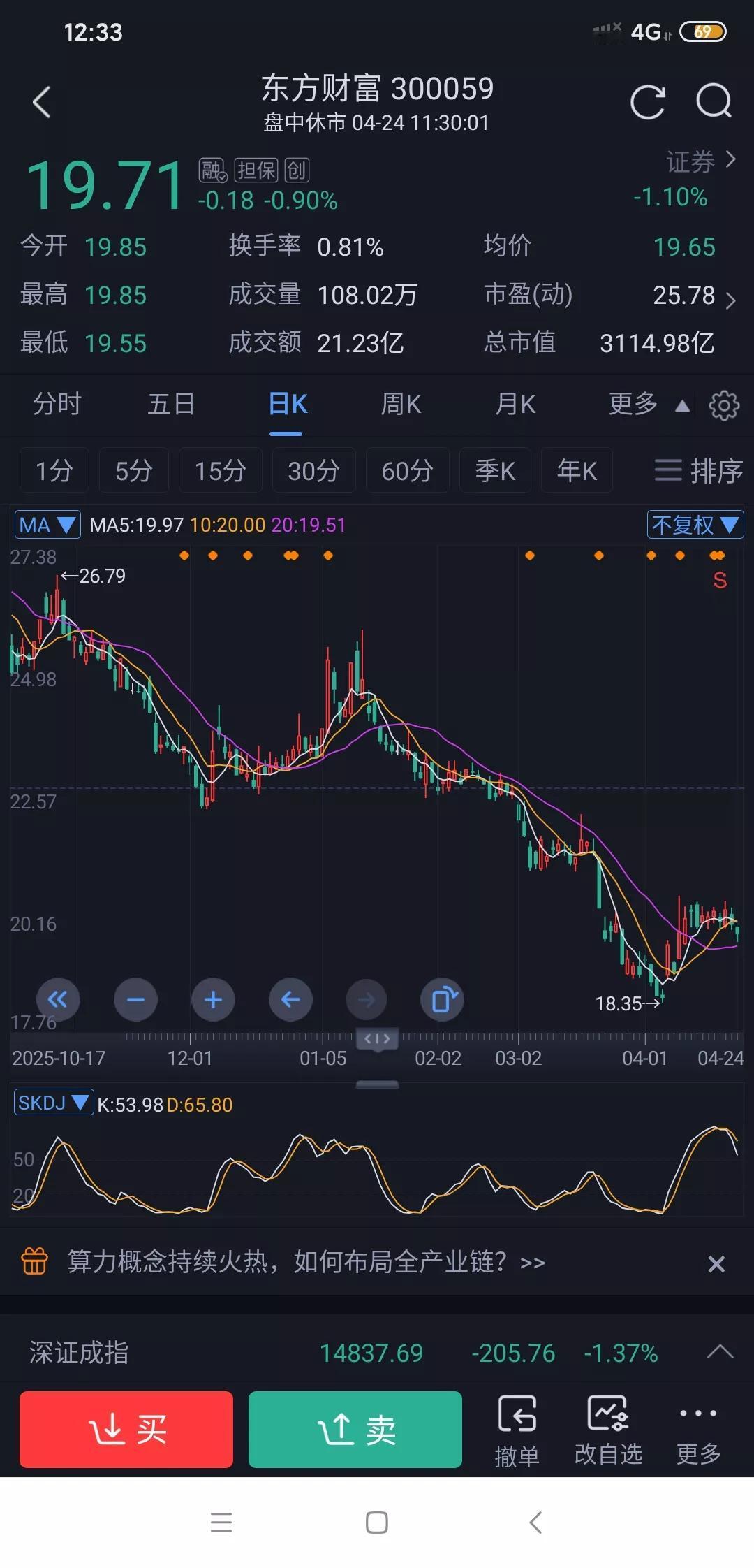 大盘在四千点震荡,一直突破不了,俗话说得好横久必跌,现在成交量缩小,市场环境不太乐观。而且东财四季度业绩下滑,这可不是好兆头。