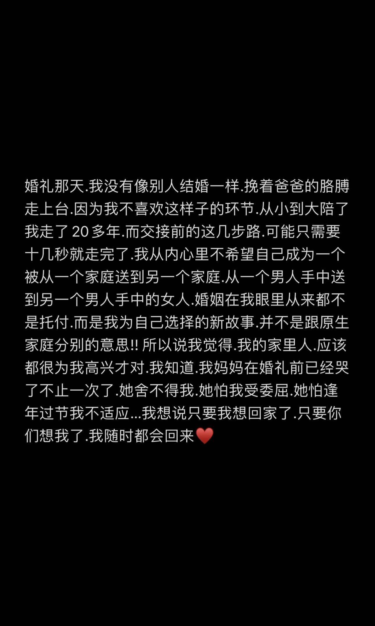 关于我的婚礼💒。婚礼那天.我没有像别人结婚一样.挽着爸爸的胳膊走上台.因为我不喜欢这样子的环节.从小到大陪了我走了20多年.而交接前的这几步路.可能只需要十几秒就走完了.我从内心里不希望自己成为一个被从一个家庭送到另一个家庭.从一个男人手中送到另一个男人手中的女人.婚姻在我眼里从来都不是托付.而是我为自己选择的新故事.并不是跟原生家庭分别的意思!! 所以说我觉得.我的家里人.应该都很为我高兴才对.我知道.我妈妈在婚礼前已经哭了不止一次了.她舍不得我.她怕我受委屈.她怕逢年过节我不适应…我想说只要我想回家了