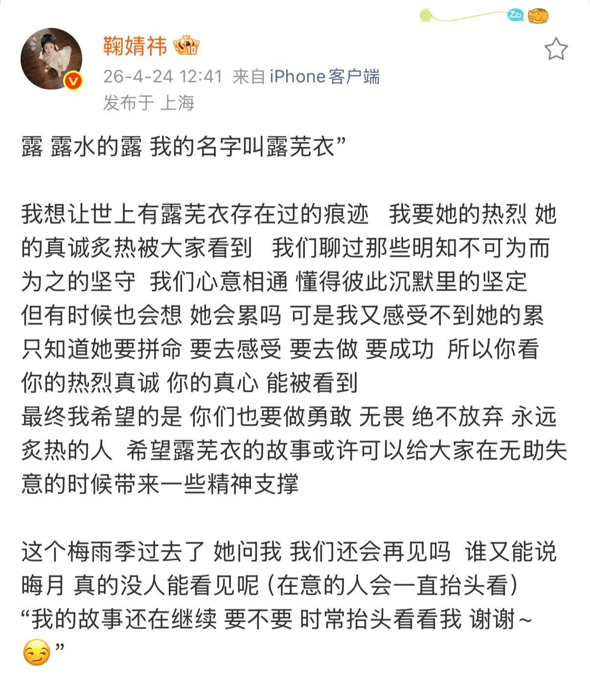 鞠婧祎发长文告别露芜衣 看了发的长文发现,她远远比我们想象中更爱露芜衣,更懂这个角色,所以才带给大家这么鲜活的小狐狸,让观众既看到了角色的真诚,更看到了鞠婧祎的真诚,她们完全是互相成就,双向奔赴来的!