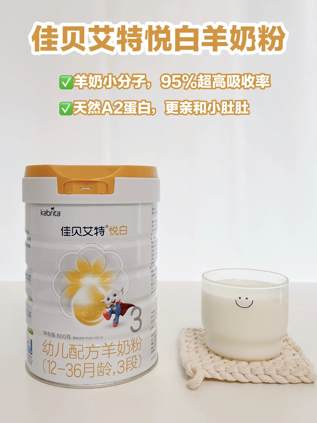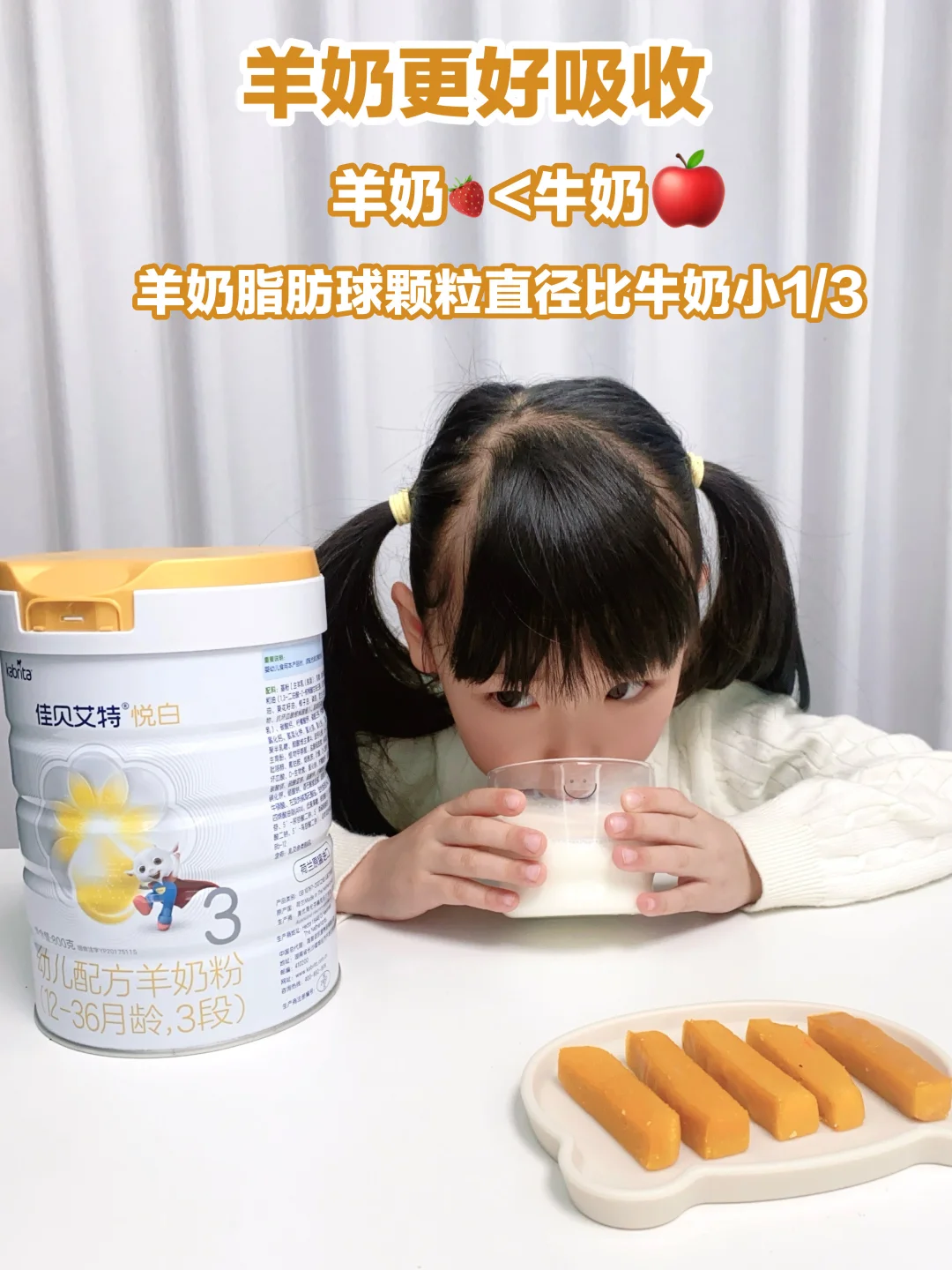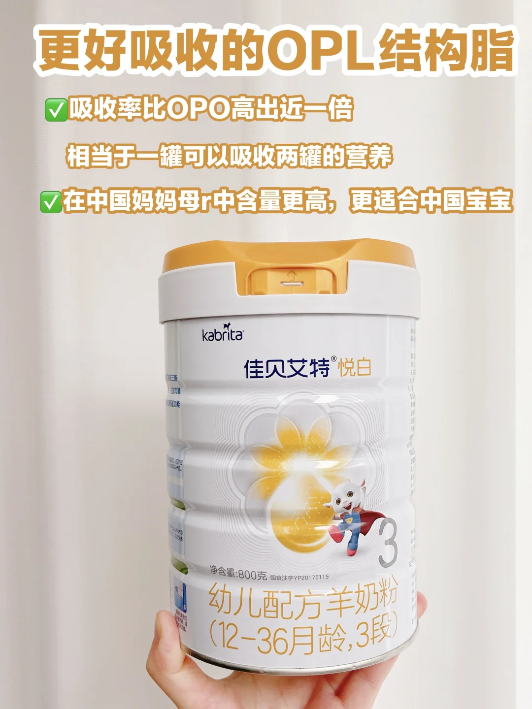 👏给我家娃喝的就是佳贝艾特悦白羊奶粉,羊奶是小分子蛋白,脂肪球颗粒比牛奶少1/3,更容易被吸收。还添加了OPL结构脂,吸收率比OPO高出近一倍,加上羊天然A2蛋白,整体吸收力率高达95%,欣欣第一次尝试就喜欢上了,而且喝了那么久,整体状态都非常👍。