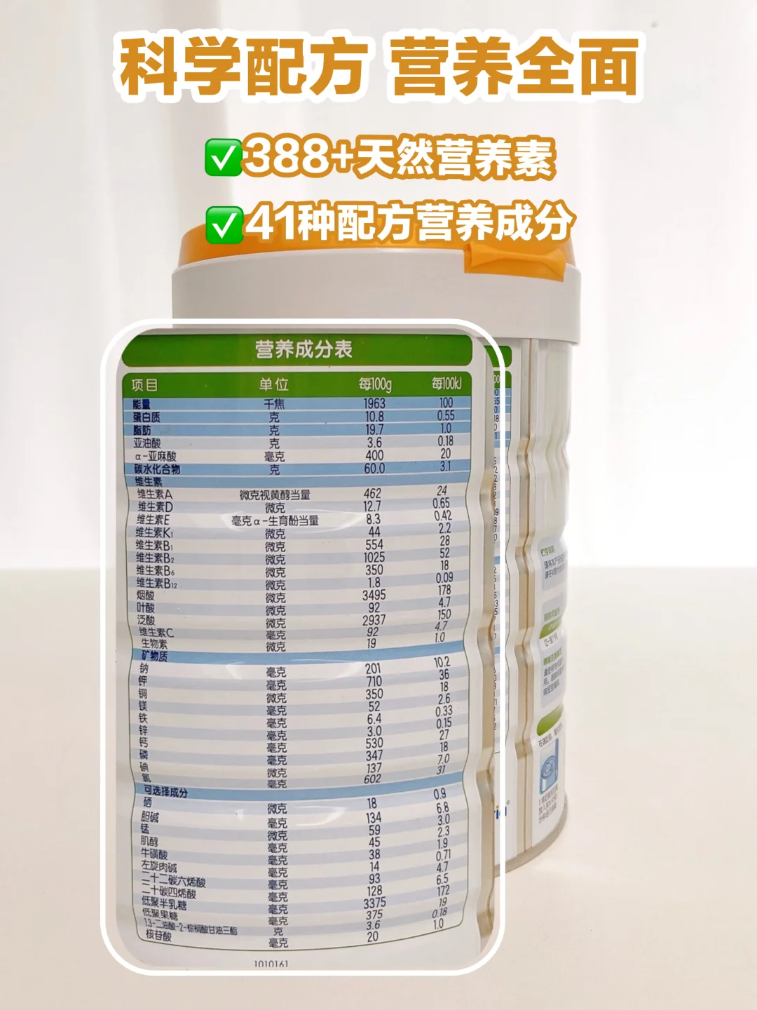 还有一点很戳我,营养够全面,388+天然营养素+41种配方营养成分,宝宝成长需要的营养基本都覆盖了,不用额外补这补那~