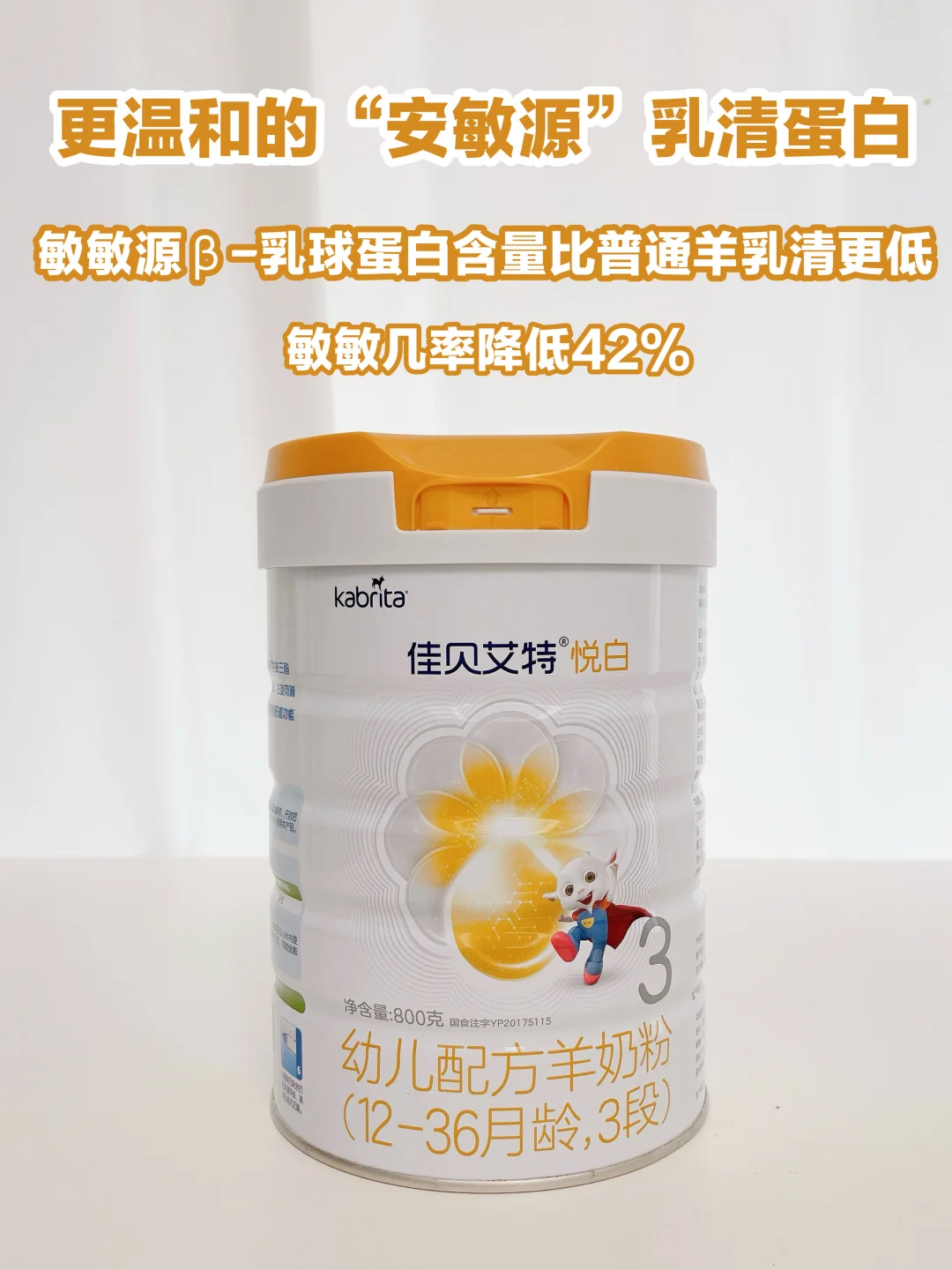 最喜欢的还是它低敏配方,羊奶中主要致敏蛋白“αs1-酪蛋白”的含量更少,添加的“安敏源”乳清蛋白,敏敏原β-乳球蛋白降低11%,敏敏率降低42%,敏宝喝着更放心。