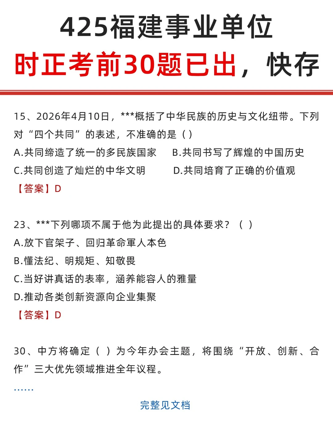 425福建事业单位考前30题,快背!