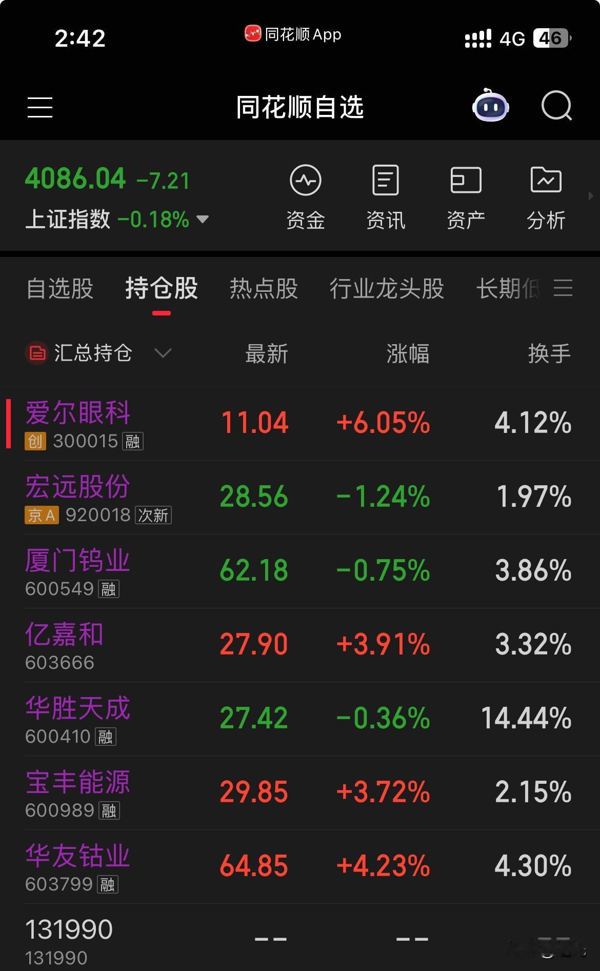 改变了操盘策略,所以持有的股票品种也发生变化。以前重逻辑和基本面轻技术面,现在反过来了。提高资金安全度,不再做左侧交易了。看看一段时间后的盈亏情况再来微调。今天微盈利几百块。卖出了金盘和盐湖,购入爱尔眼科,宝丰,亿嘉和,华胜和华友。