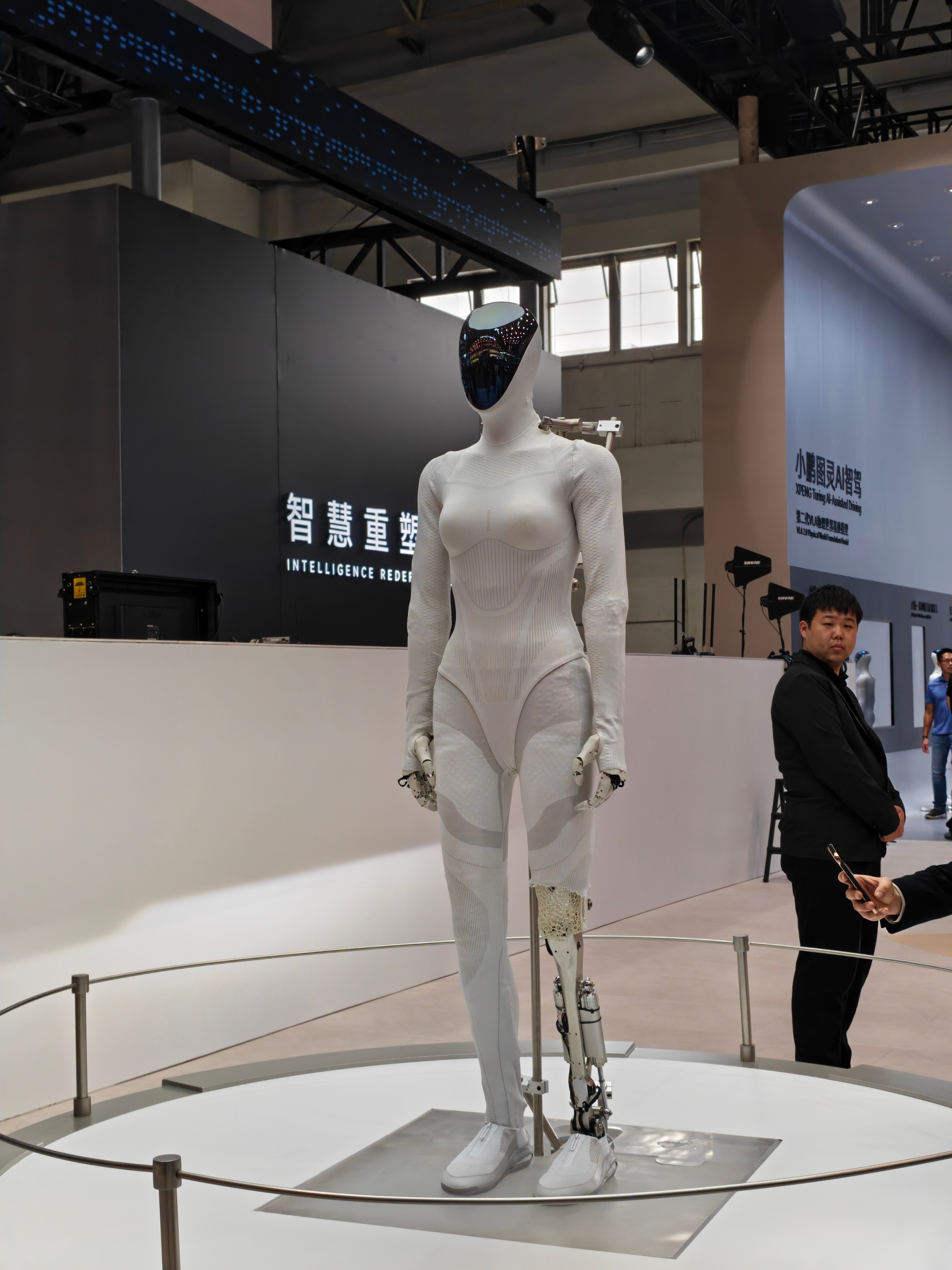 来到了小鹏展台,虽说今天展出的重点是刚刚发布的小鹏GX,但我们熟悉的老朋友小鹏AI机器人“Iron”也来到了现场,还是曾经为了证明自己是真机器人而剪下腿部保护泡棉的那位。小鹏物理AI全品类登陆北京车展