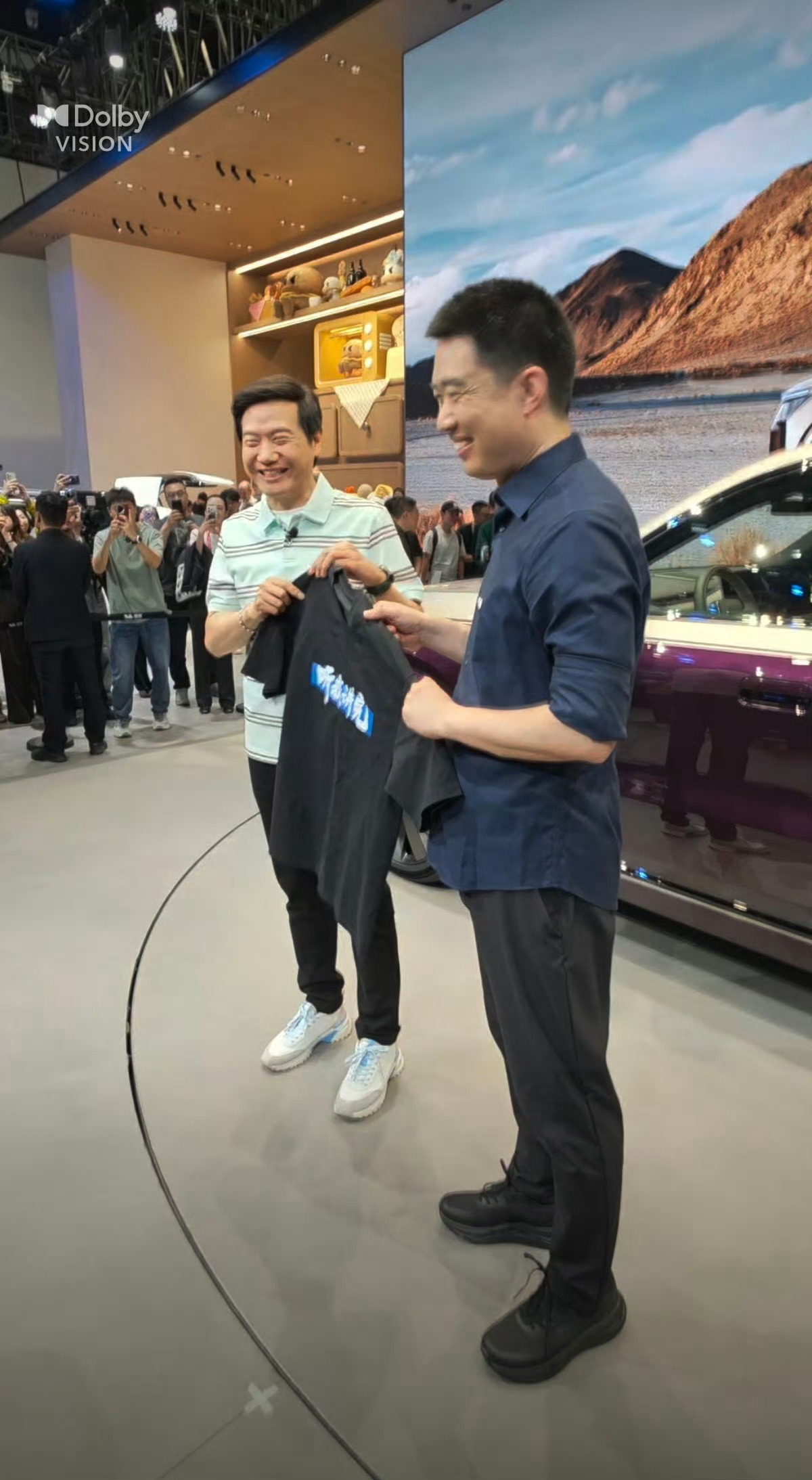 雷总今天下午开始逛展,第一个出发的车企就是同在北京的理想汽车,两家展台挨着。雷军送李想听我讲完T恤