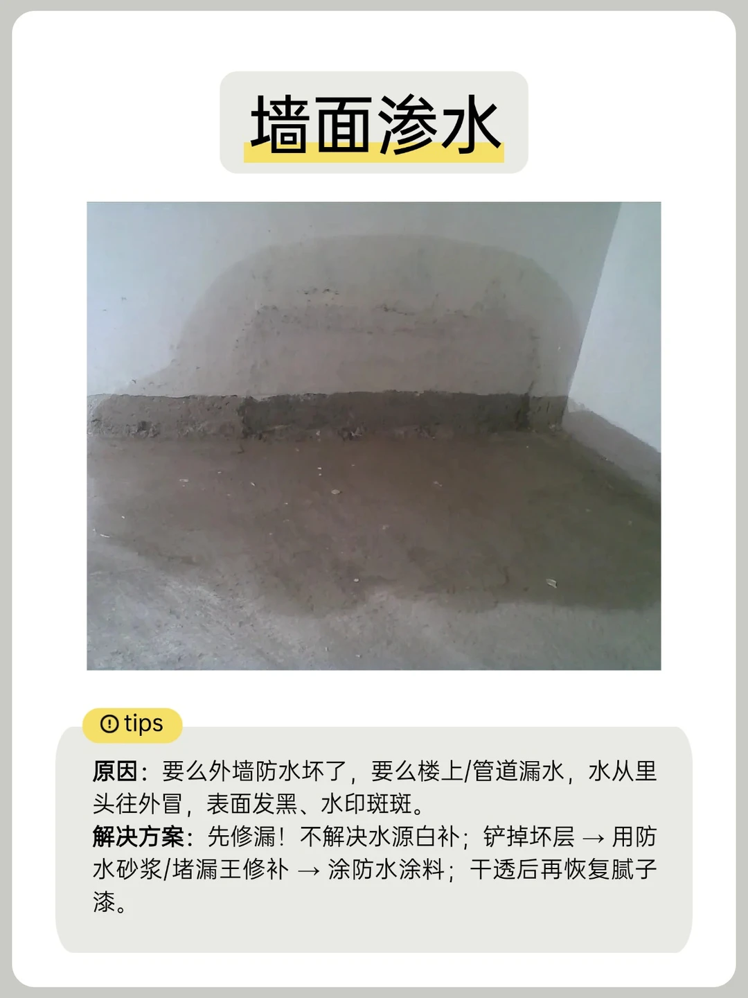 ⭐️解决方案:先修漏!不解决水源白补;铲掉坏层 → 用防水砂浆/堵漏王修补 → 涂防水涂料;干透后再恢复腻子漆。